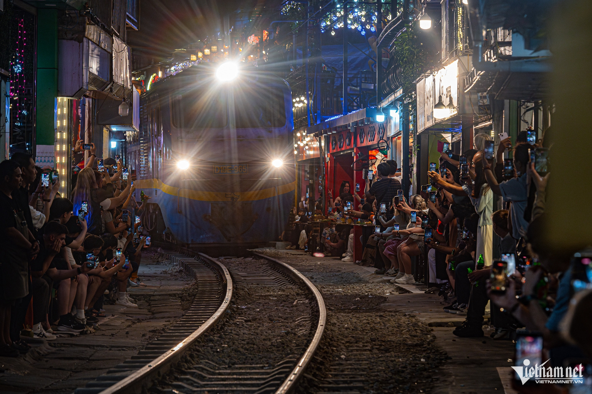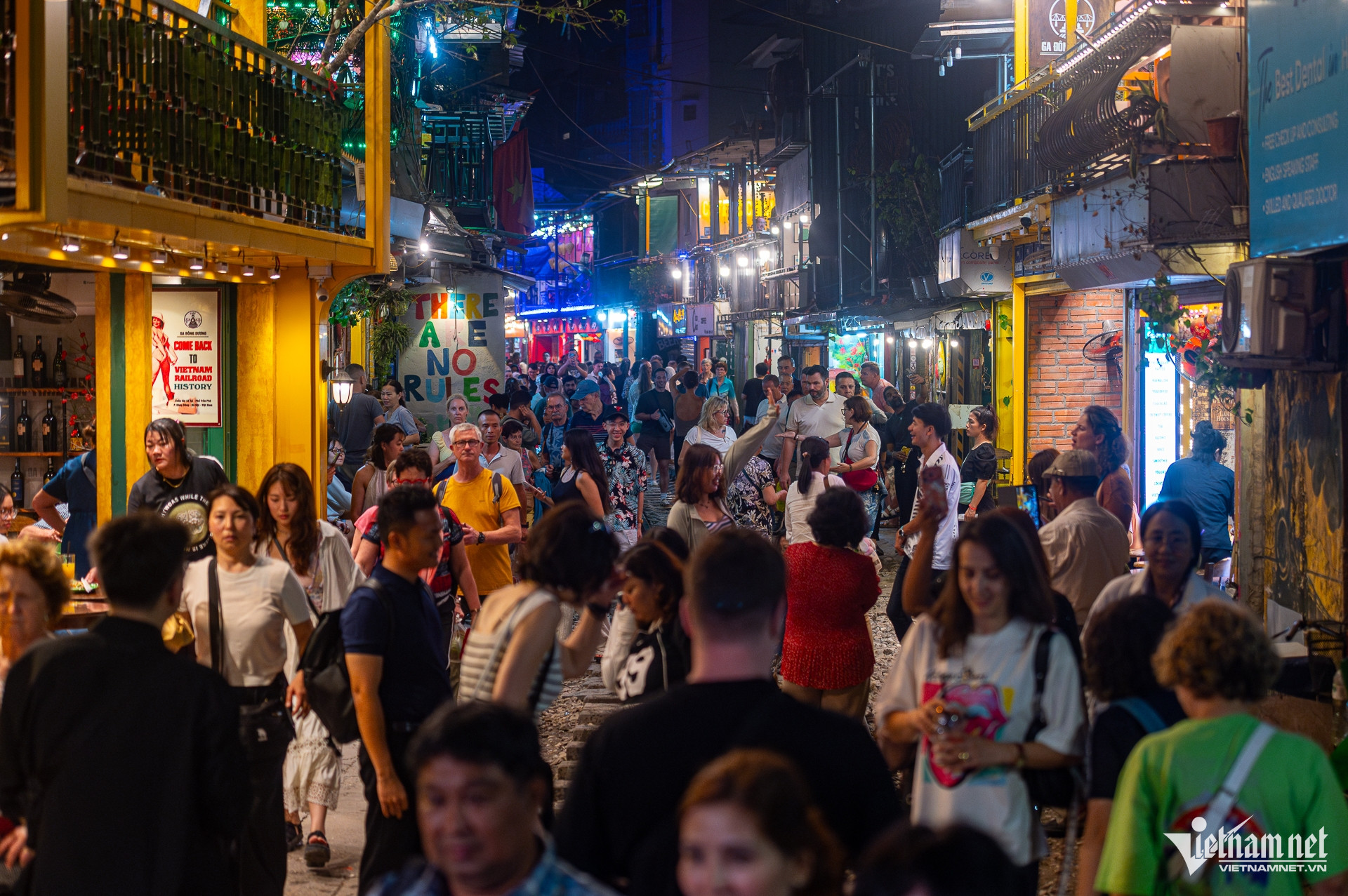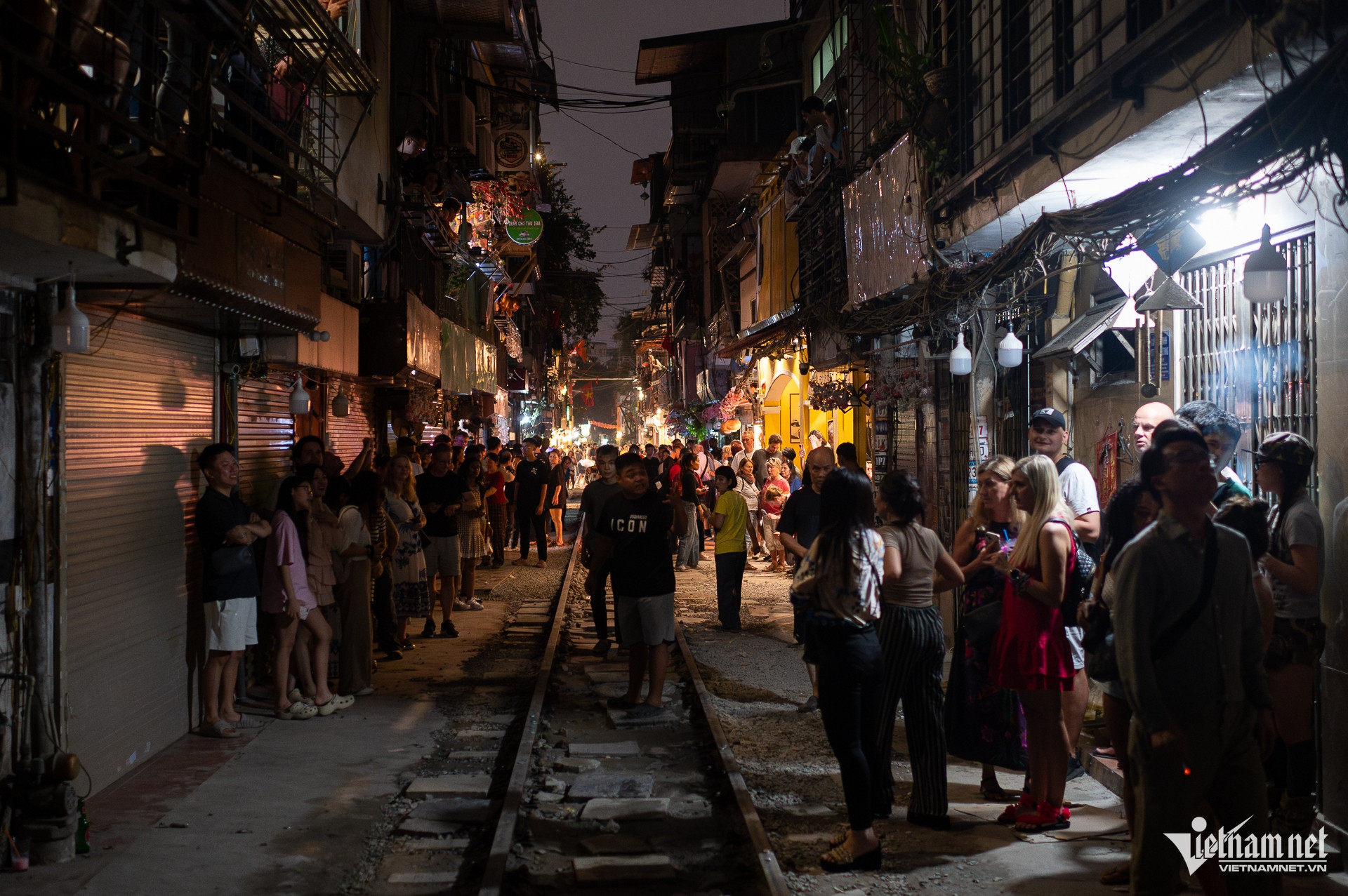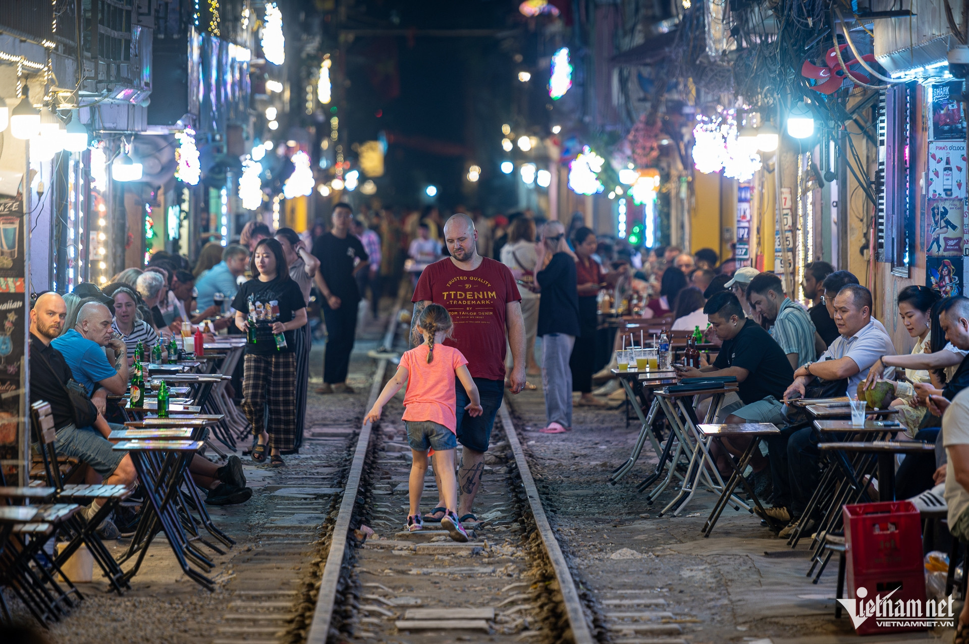 Các hàng quán bày bàn ghế tràn lan dọc đường tàu, trong khi khoảng cách tối thiểu của hành lang bảo vệ là 3m.
