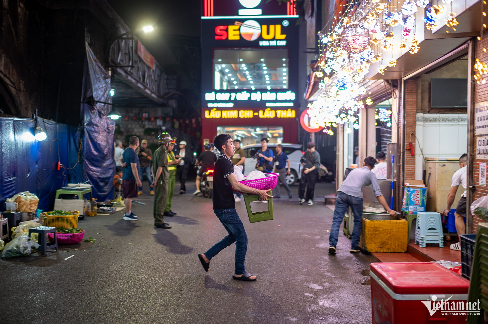 Tương tự, tại khu vực phố Gầm Cầu, nhiều hộ kinh doanh vội thu dọn khi thấy lực lượng chức năng xuất hiện từ xa.