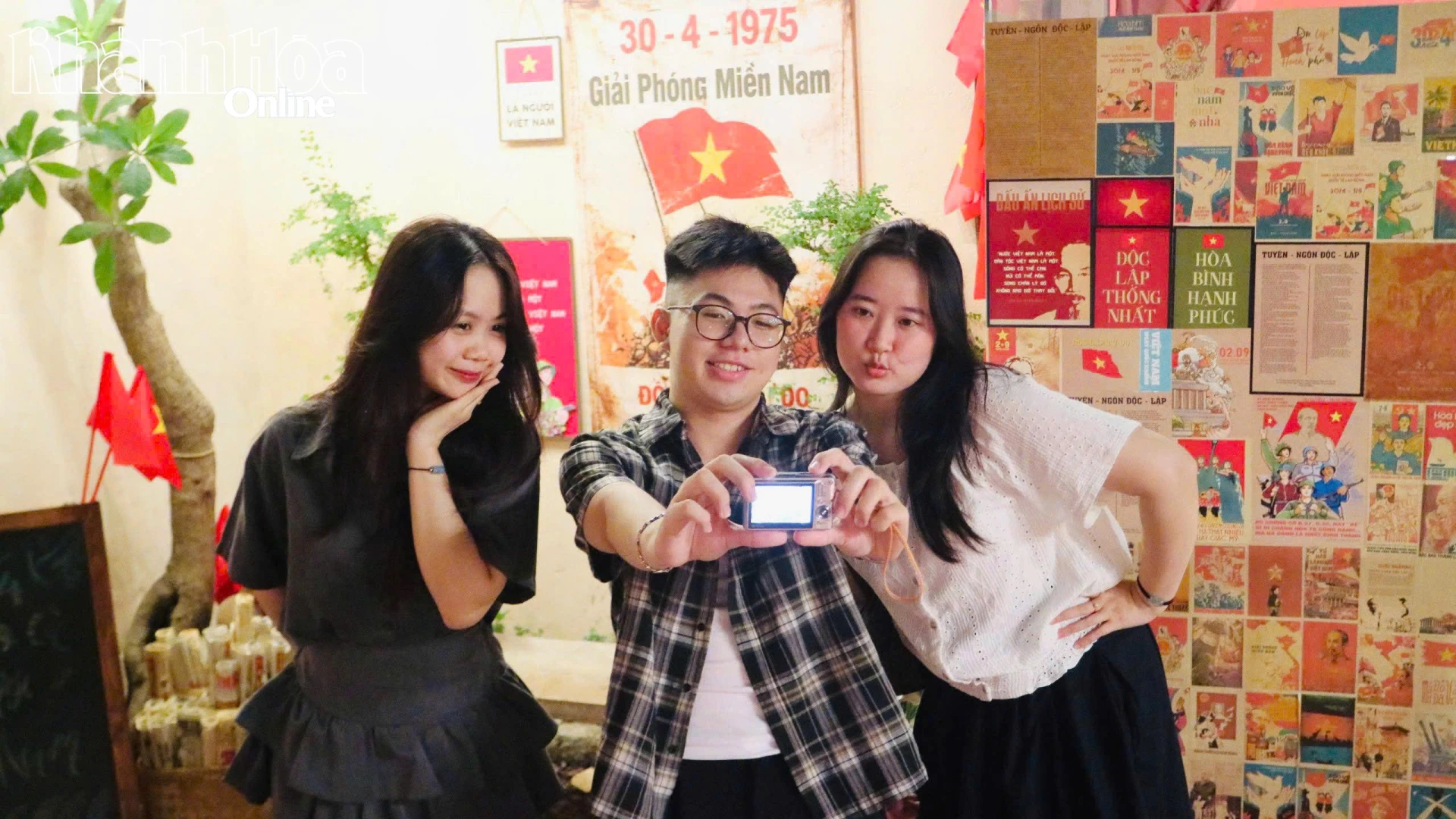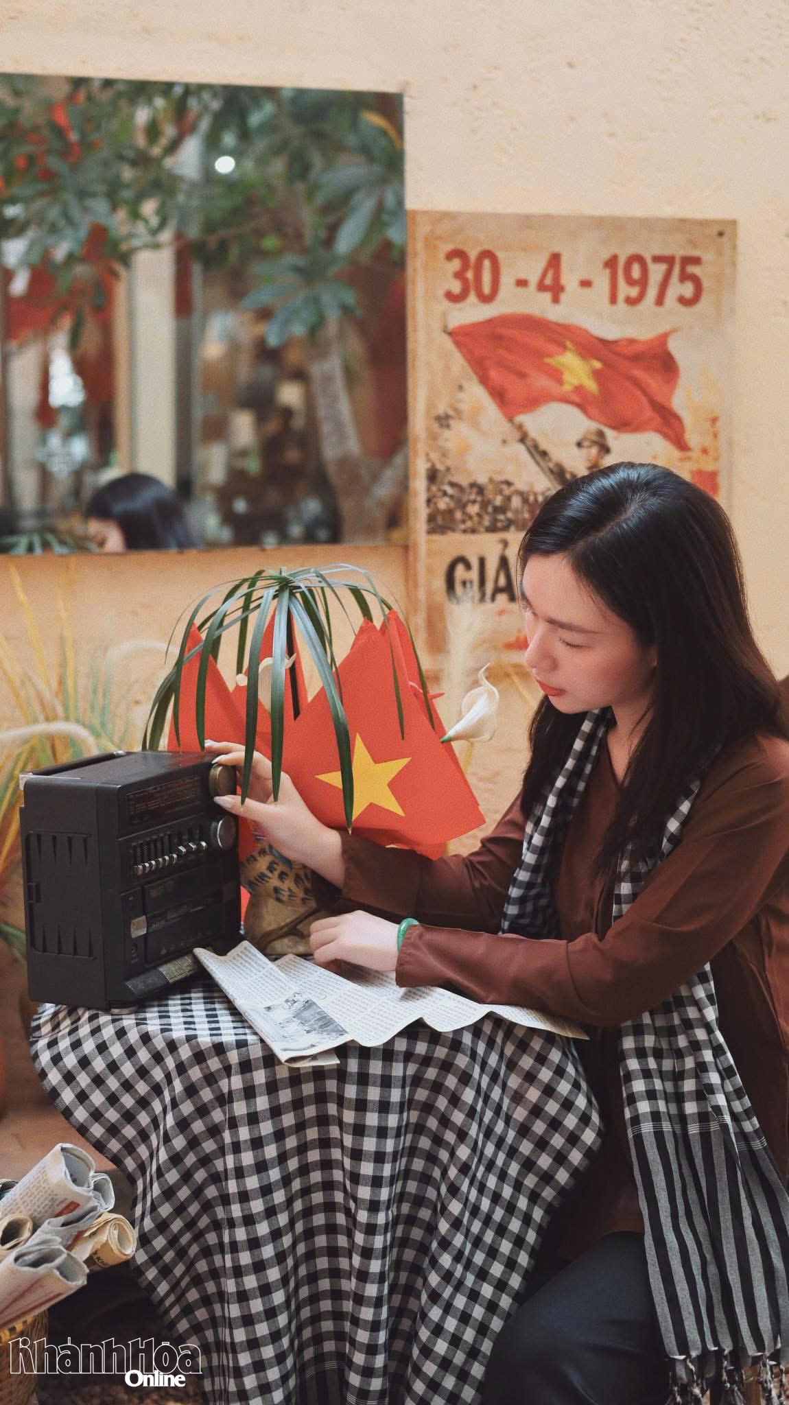 Tương tự, bạn Nguyễn Thị Bình (phường Nam Nha Trang) cũng lựa chọn một quán cà phê trang trí theo chủ đề 30 -4 để check-in cùng bạn bè. “Được chụp trong bối cảnh này mình thấy rất tự hào và biết ơn các thế hệ cha anh đã anh dũng chiến đấu, hy sinh để có hòa bình, độc lập như ngày hôm nay”, Bình chia sẻ.