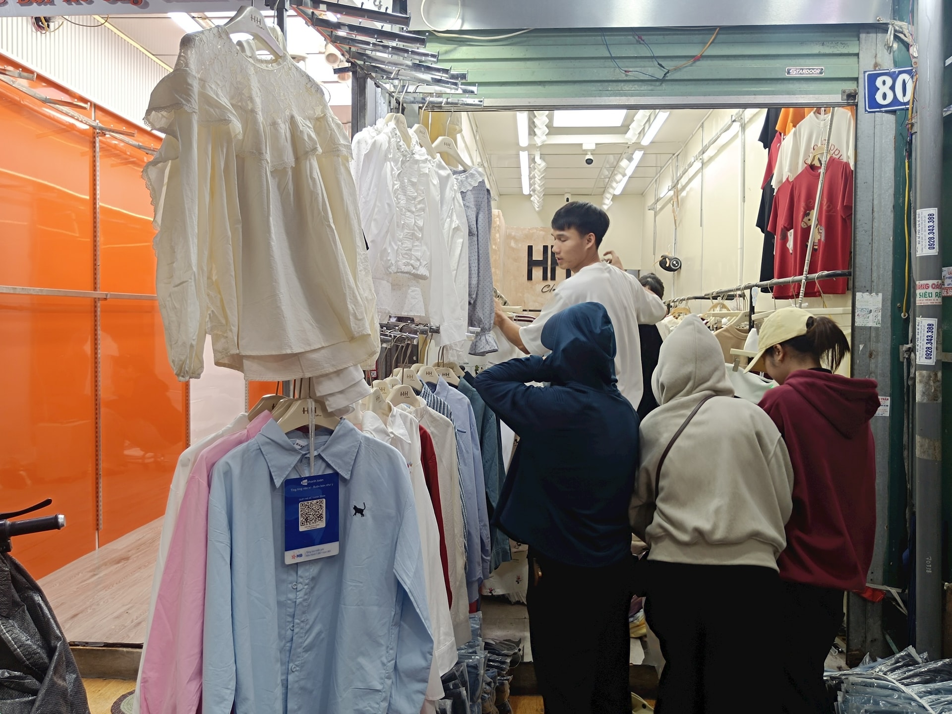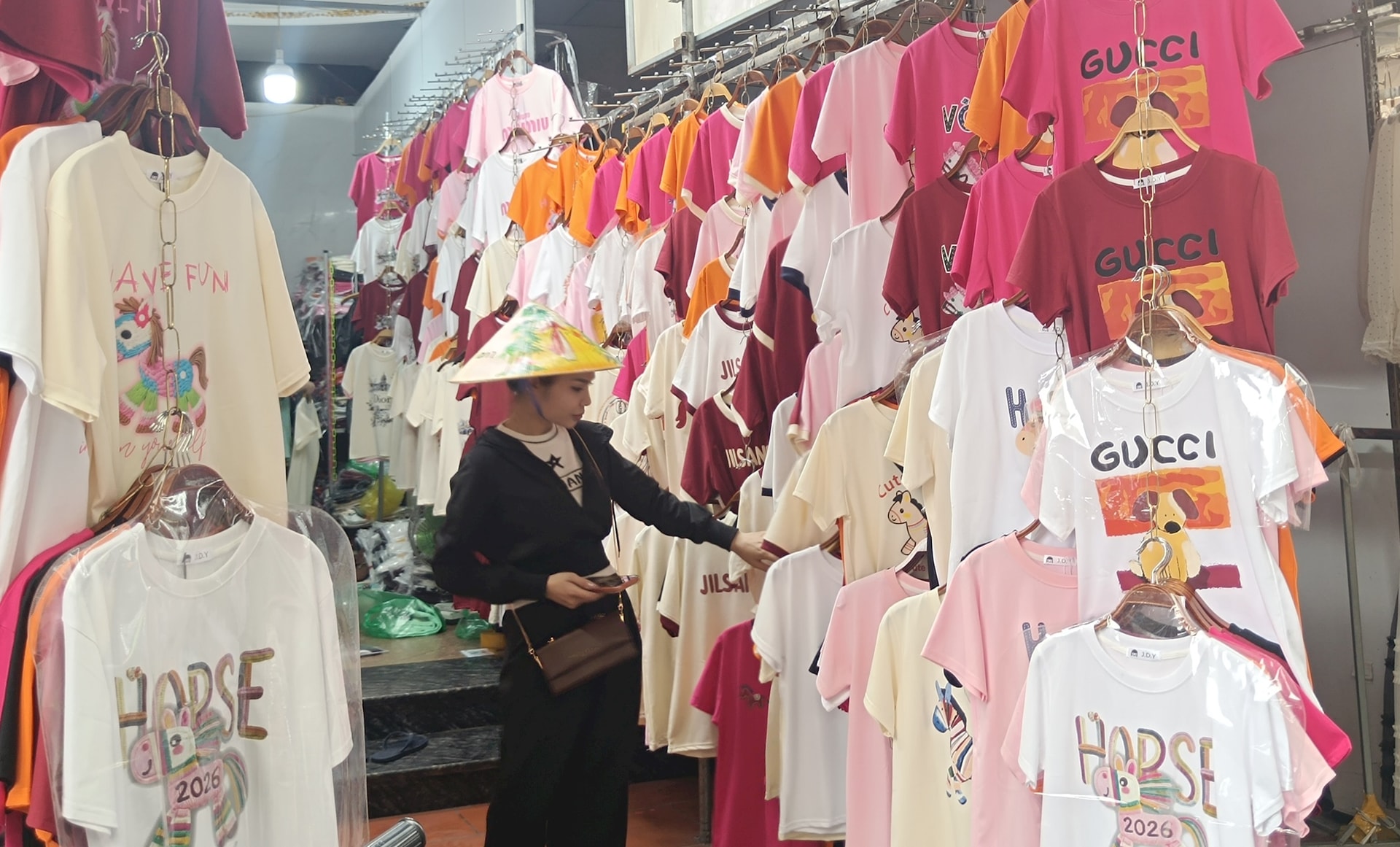 Một tiểu thương bày bán áo lên sạp trong sáng mùng 6 Tết.