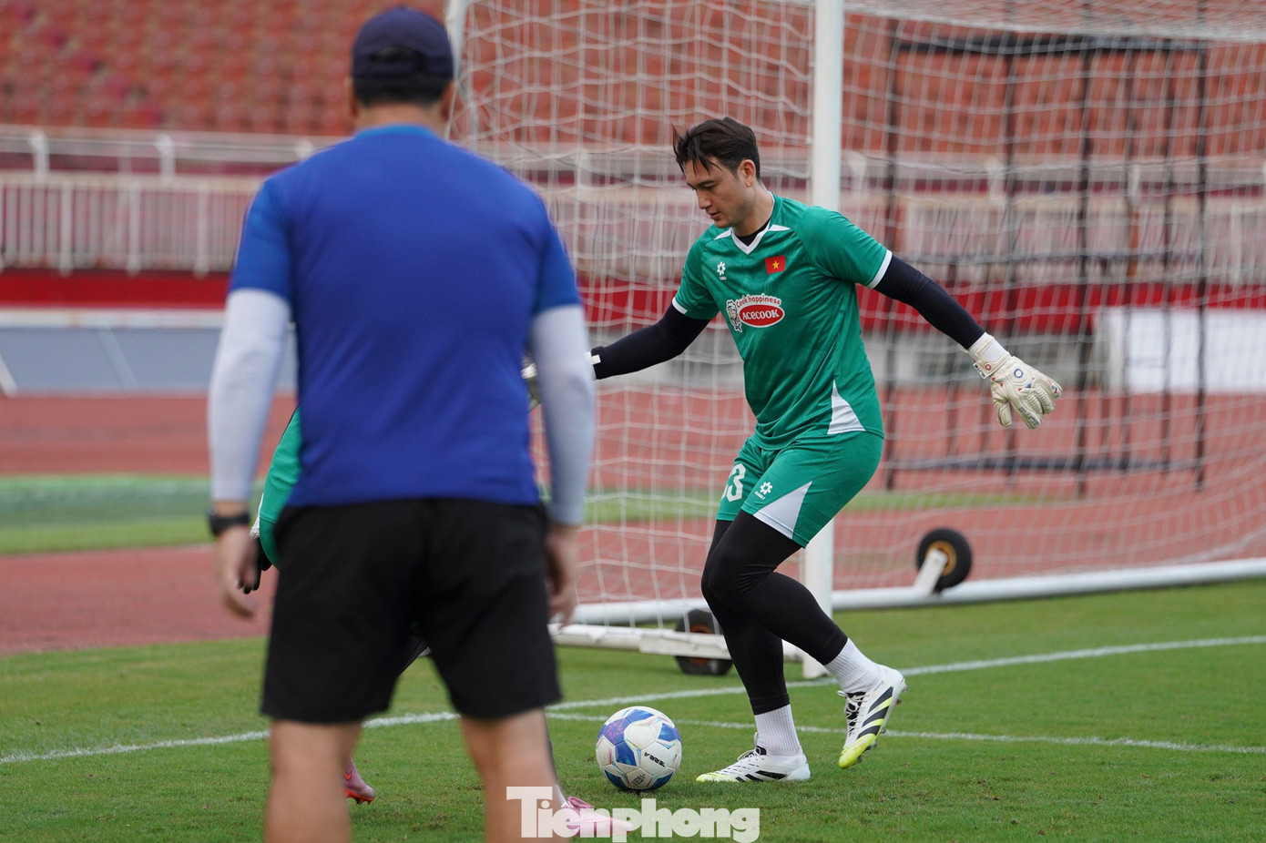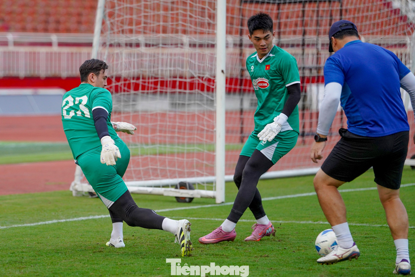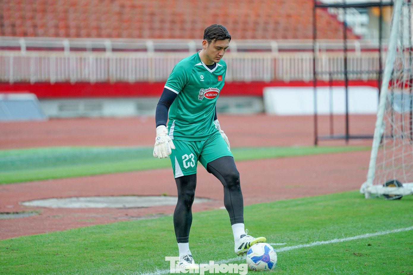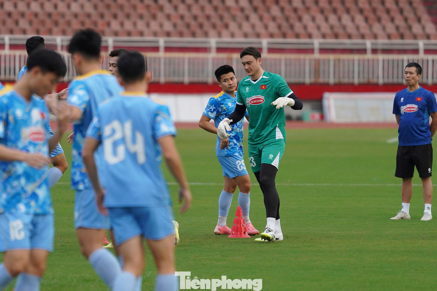Văn Lâm, sau vài sai lầm đáng tiếc ở lượt đi trên sân Gò Đậu, tỏ ra đặc biệt tập trung. Anh chủ động trao đổi thêm với HLV Lee Won-jae sau mỗi tình huống, điều chỉnh nhịp ra bóng và khả năng chuyền một chạm. Trung Kiên và Văn Việt cũng cho thấy sự tiến bộ rõ rệt, phối hợp nhịp nhàng trong các bài phản xạ chân và phát bóng dài.