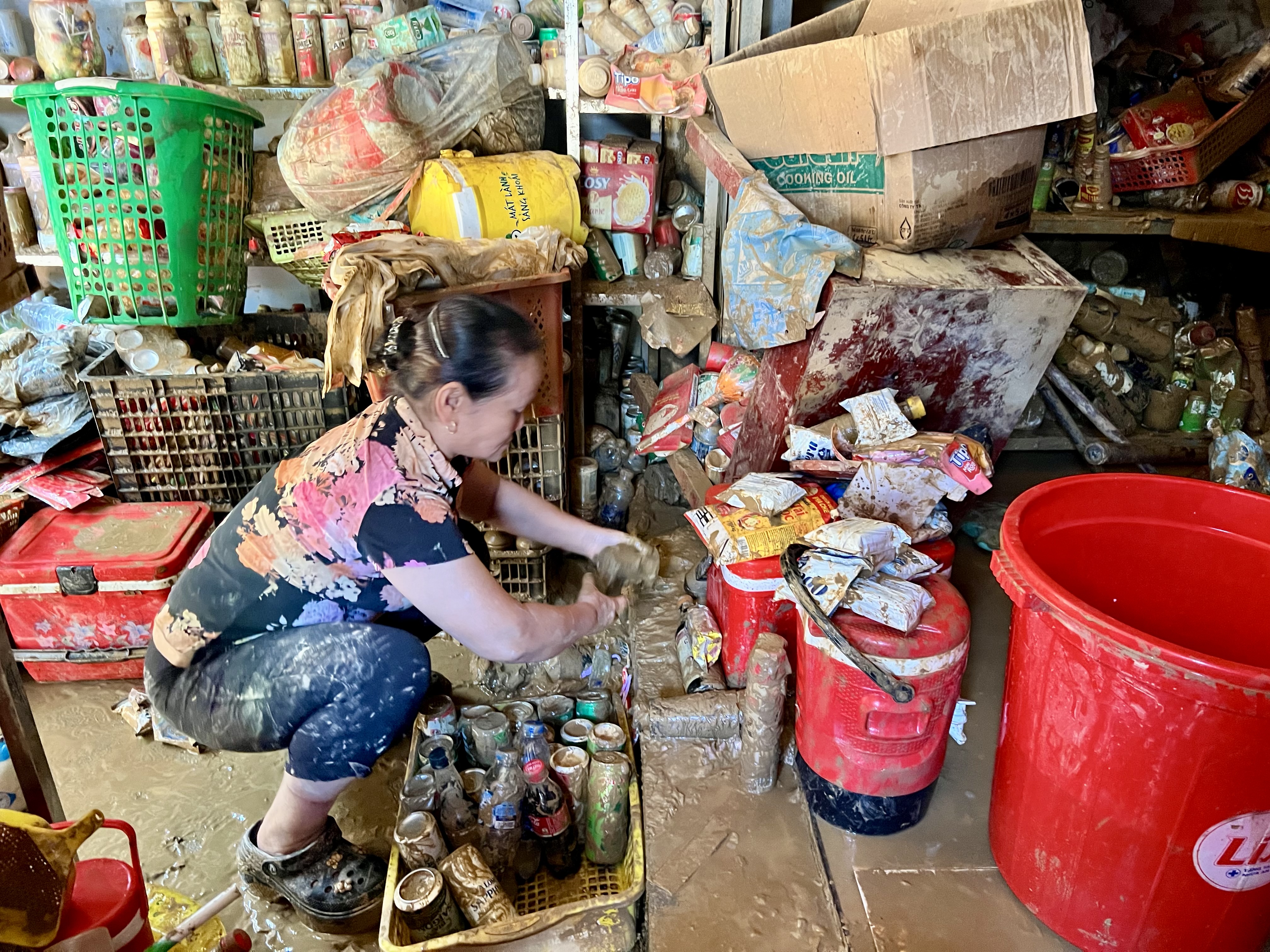 Tiểu thương kinh doanh bánh kẹo cố gắng "vớt vát" tài sản sau bão lũ.