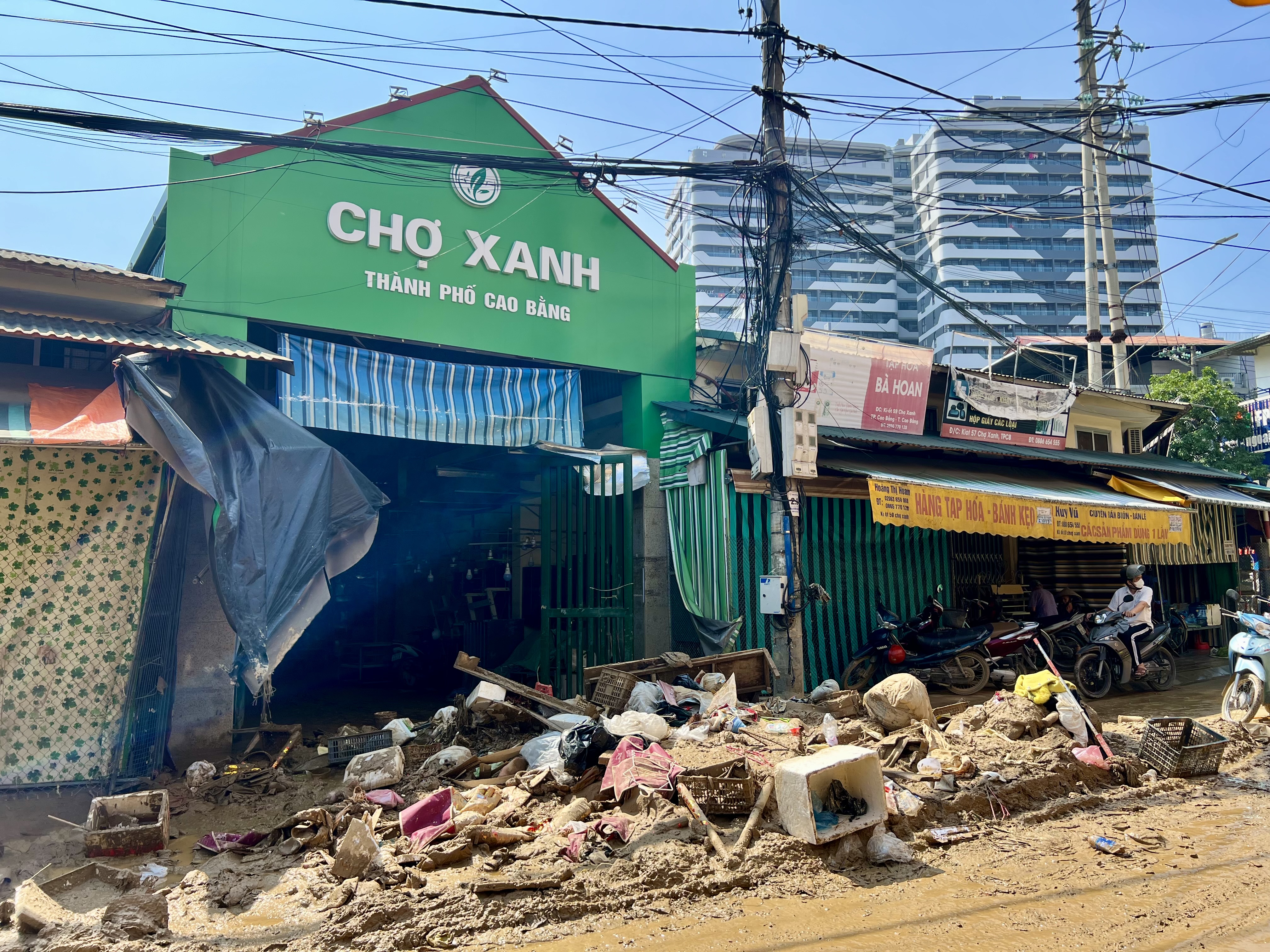Do ảnh hưởng của hoàn lưu bão số 10 và số 11 khiến nước sông Bằng dâng nhanh, tràn vào khu chợ Xanh và các hộ kinh doanh lân cận. Toàn bộ khu chợ chìm trong biển nước, có nơi ngập sâu hơn 2 mét. Những dãy sạp bán hàng vốn tấp nập nay chỉ còn lại bùn đất và những kệ hàng đổ nát, khiến nhiều tiểu thương chịu thiệt hại hàng trăm triệu đồng đến tỷ đồng, thậm chí mất trắng toàn bộ cơ nghiệp tích góp bao năm. “Còn gì nữa đâu” - đó là câu trả lời chung của hầu hết tiểu thương khi nói đến những thiệt hại, tổn thất. Khu chợ Xanh sầm uất, nhộn nhịp nhất khu vực, giờ chỉ còn lại những đống ngổn ngang bùn đất, những kệ hàng, biển hiệu đổ nát và tiếng máy xúc, máy bơm dọn dẹp.