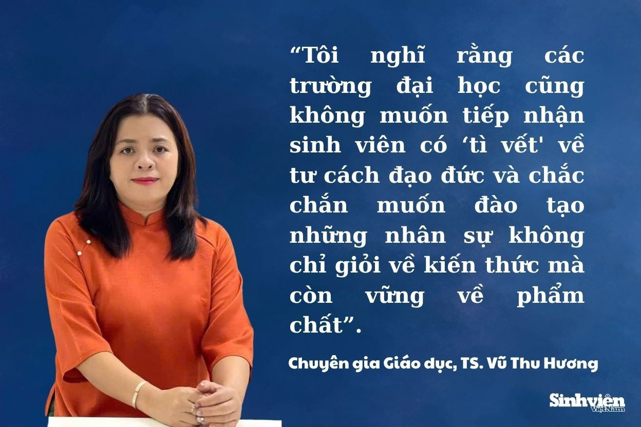 TS. Vũ Thu Hương: Tôi cho rằng đây chính là mong muốn của tất cả các trường đại học: họ không muốn tiếp nhận sinh viên có "tì vết" về tư cách đạo đức và chắc chắn muốn đào tạo những nhân sự không chỉ giỏi về kiến thức mà còn vững về phẩm chất.