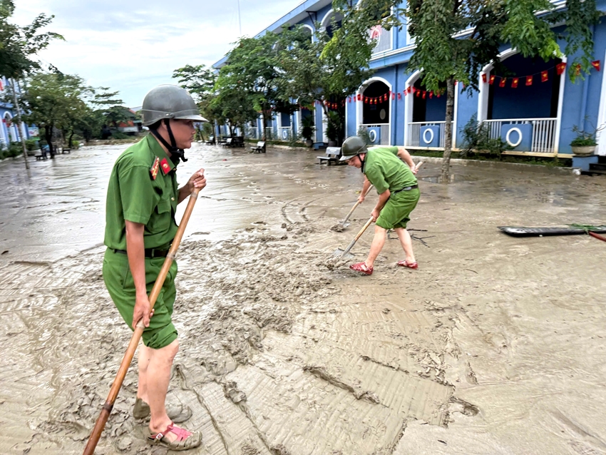 Lực lượng công an hỗ trợ dọn lũ ở Trường Tiểu học Dương Nỗ