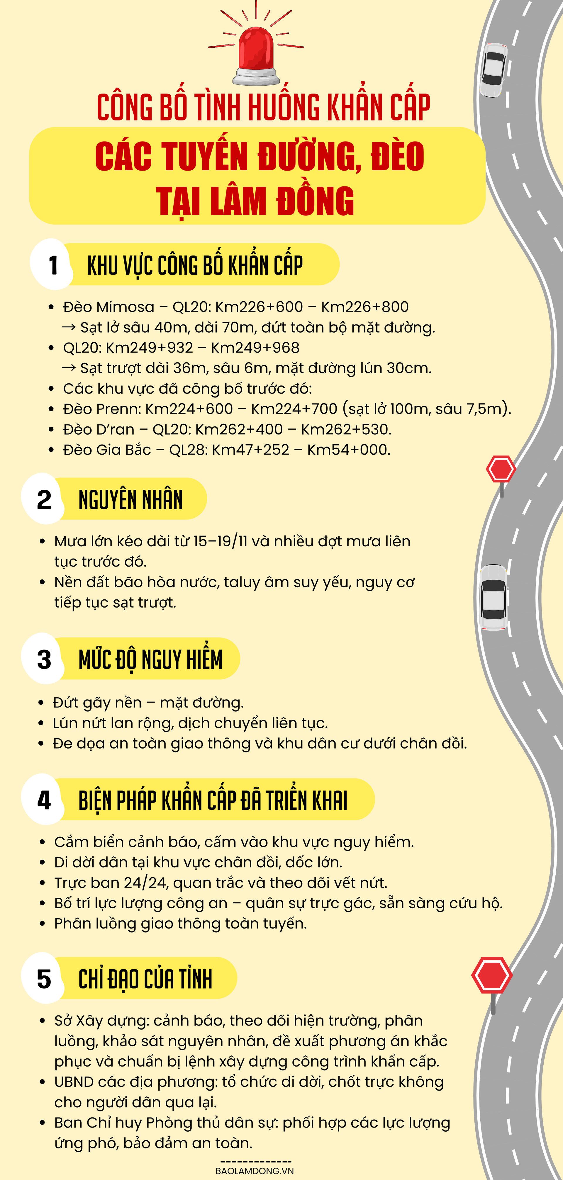 Trước thực trạng này, UBND tỉnh Lâm Đồng đã công bố tình huống khẩn cấp về thiên tai tại một số vị trí tại 3 đường đèo và Quốc lộ 20, cửa ngõ dẫn vào trung tâm tỉnh Lâm Đồng.
