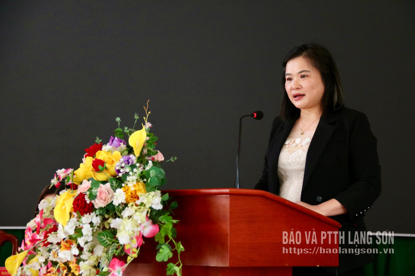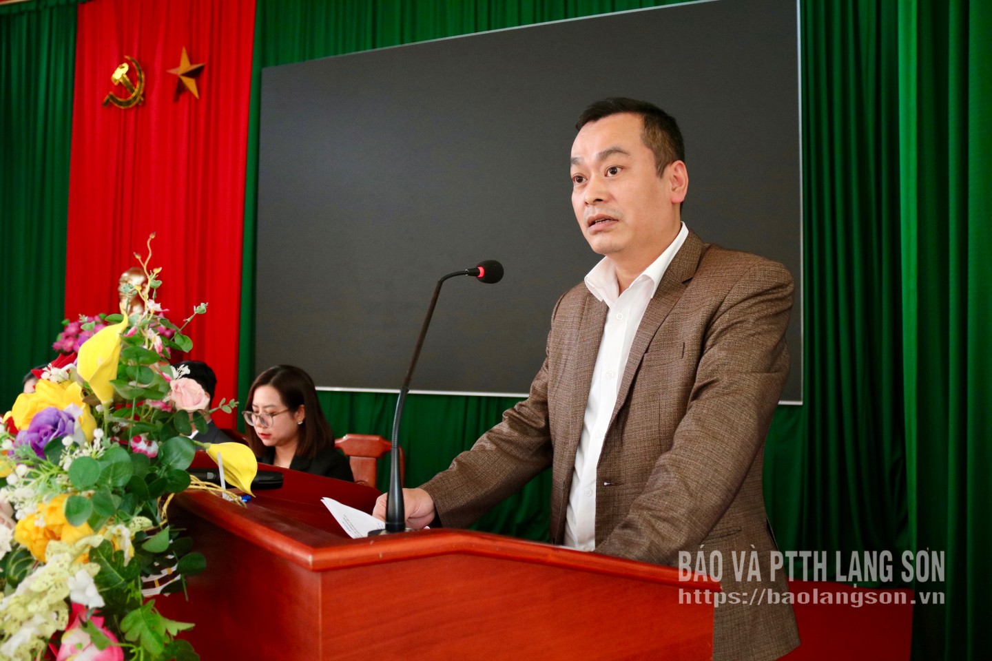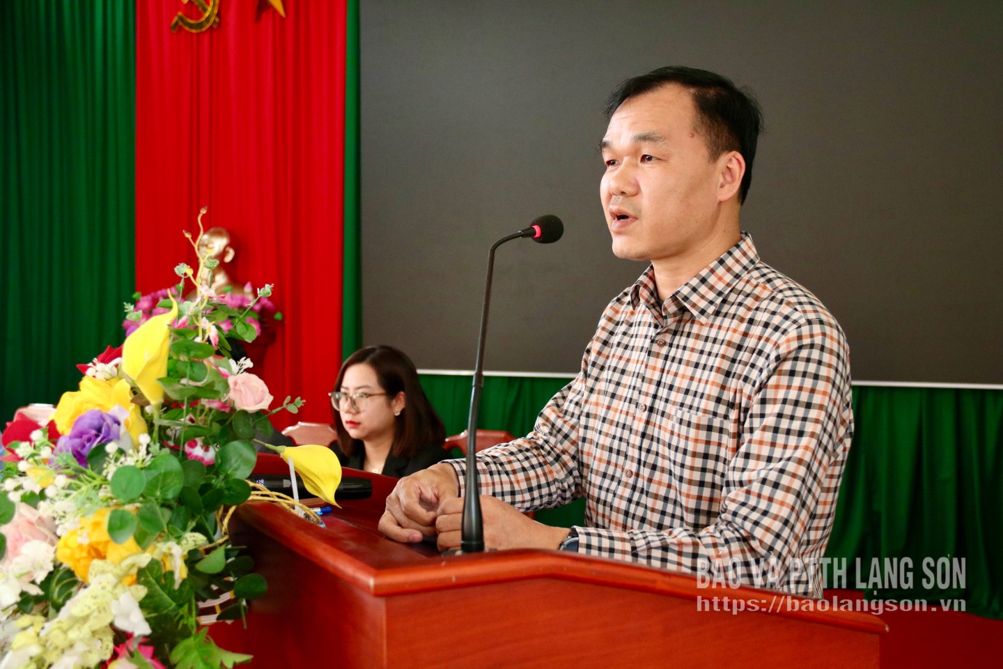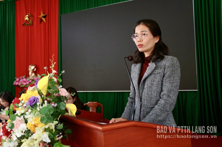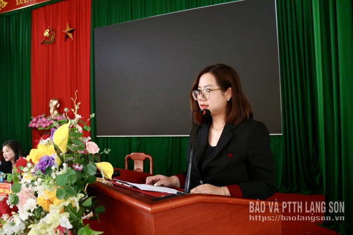 Bà Mã Thị Thủy, Phó Chánh Văn phòng Đảng ủy xã Vân Nham trình bày chương trình hành động tại hội nghị
