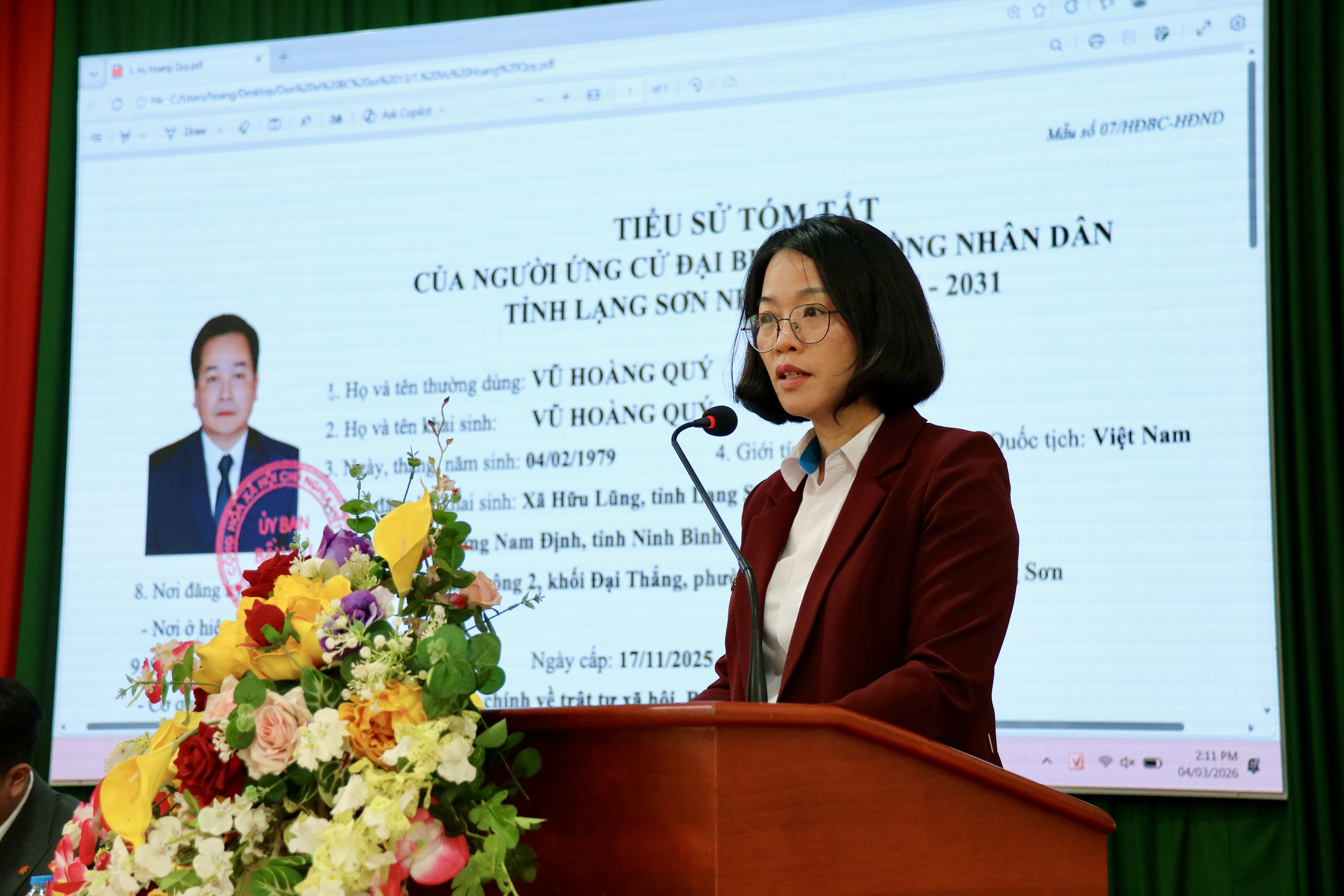Đại diện Ủy ban MTTQ Việt Nam tỉnh giới thiệu tiểu sử các ứng cử viên đại biểu HĐND tỉnh nhiệm kỳ 2026 - 2031
