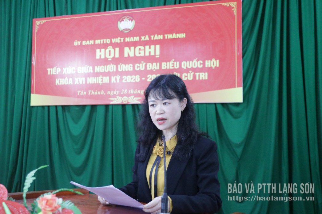 Bà Đồng Thị Lệ Thủy, chuyên viên Văn phòng Ủy ban MTTQ Việt Nam tỉnh Lạng Sơn trình bày chương trình hành động tại hội nghị tiếp xúc cử tri vận động bầu cử tại xã Tân Thành