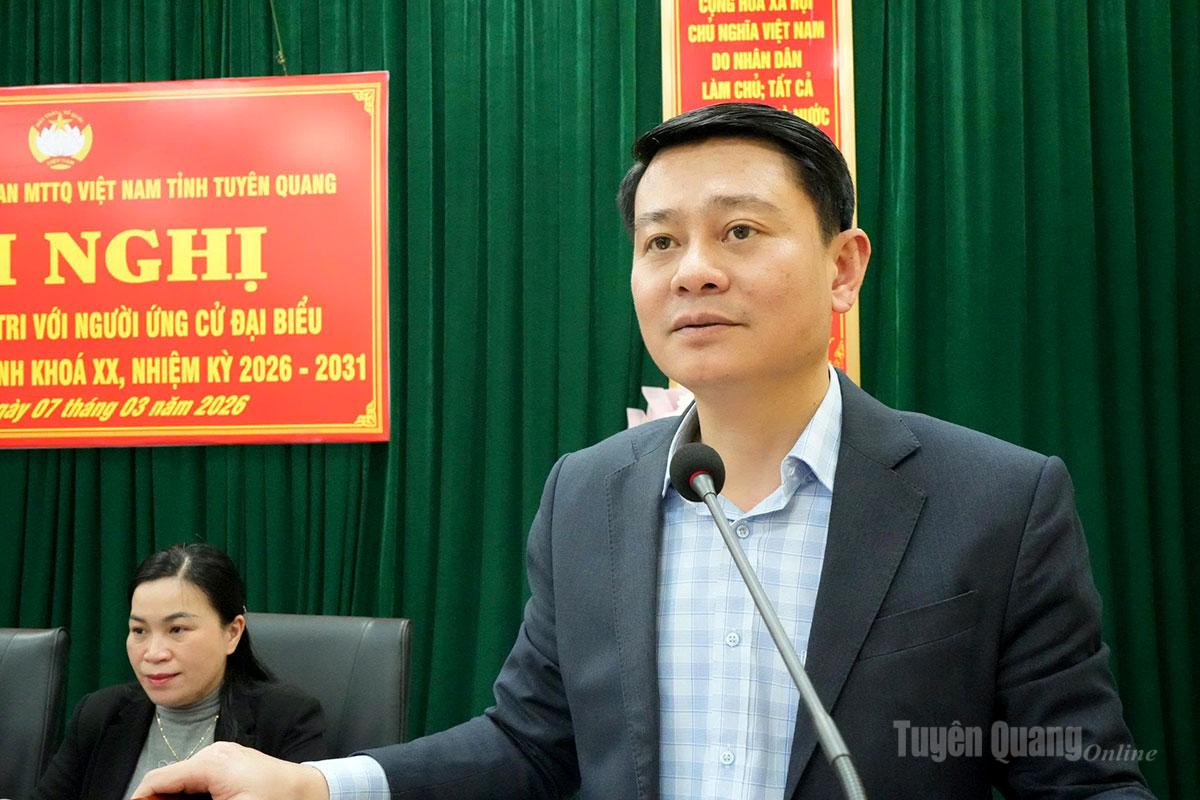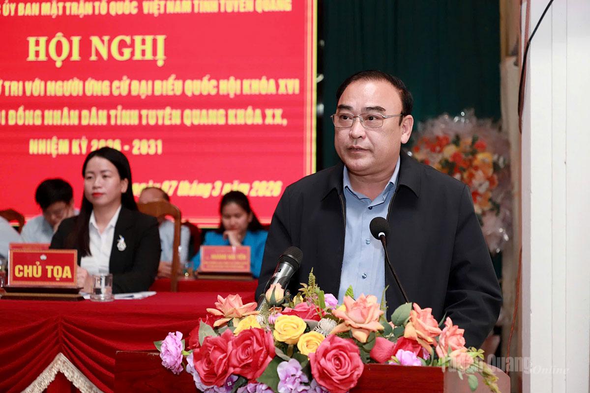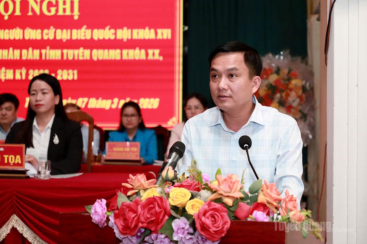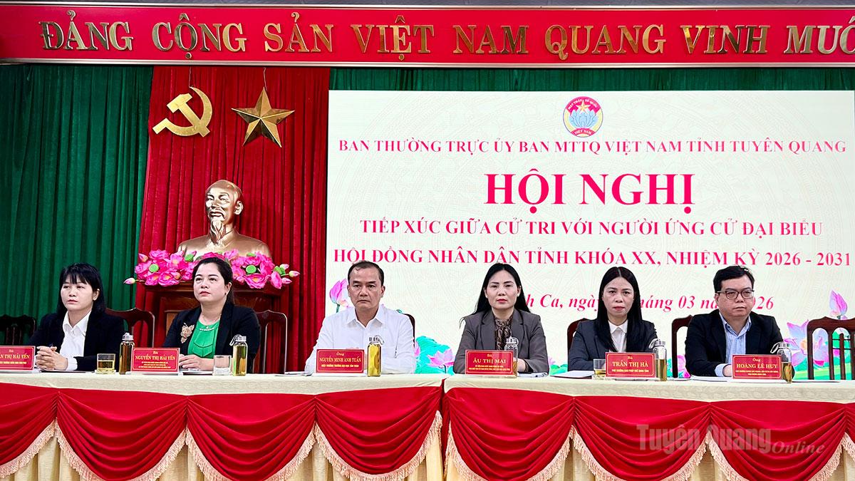 Tại Hội nghị, đại diện Ban Thường trực Ủy ban MTTQ Việt Nam tỉnh đã giới thiệu tiểu sử tóm tắt của các ứng cử viên đại biểu HĐND tỉnh khóa XX, nhiệm kỳ 2026 - 2031, đơn vị bầu cử số 2 gồm các ông, bà: Âu Thị Mai, Ủy viên BCH Đảng bộ tỉnh, Phó Chủ tịch Ủy ban MTTQ Việt Nam tỉnh, Chủ tịch Hội LHPN tỉnh; Trần Thị Hà, Phó Trưởng ban Pháp chế, HĐND tỉnh; Hoàng Lê Huy, Phó Trưởng phòng Quy hoạch Đầu tư xây dựng, Văn phòng UBND tỉnh; Nguyễn Thị Hồng Xiêm, Phó Trưởng phòng Đô thị và Nhà ở, Sở Xây dựng tỉnh; Nguyễn Minh Anh Tuấn, Hiệu trưởng Trường Đại học Tân Trào; Nguyễn Thị Hải Yến, Bí thư Đoàn xã Hồng Sơn; Trần Thị Hải Yến, giáo viên trường Mầm non Văn Phú, xã Hồng Sơn.