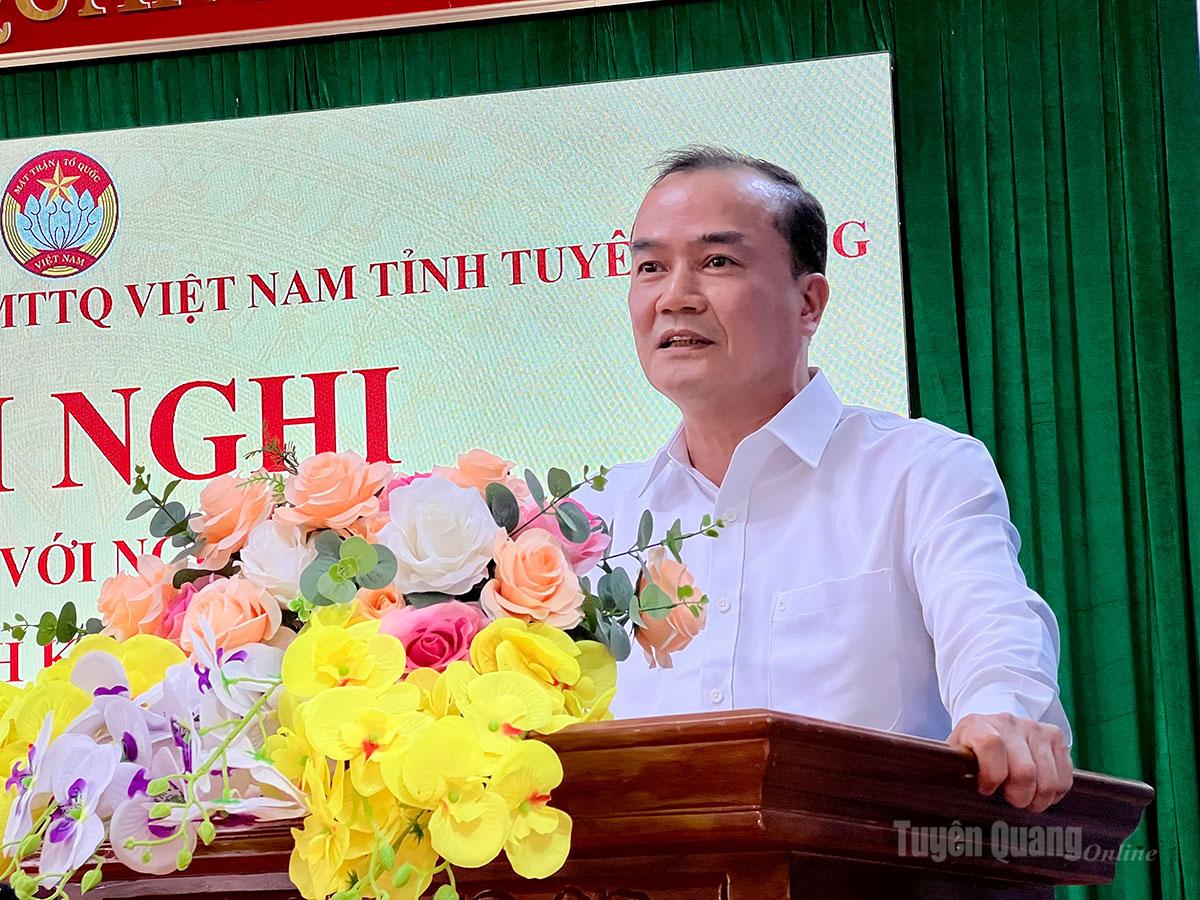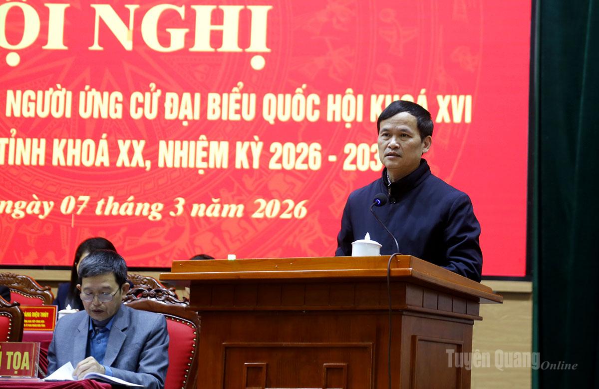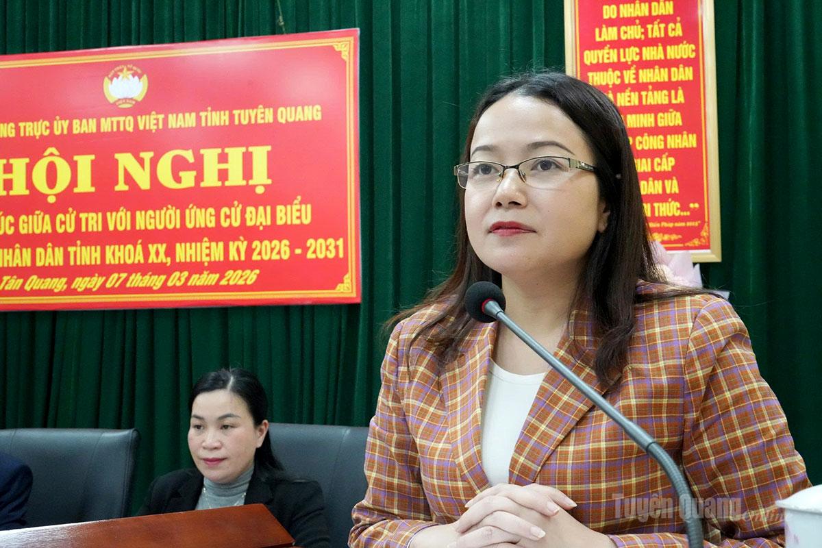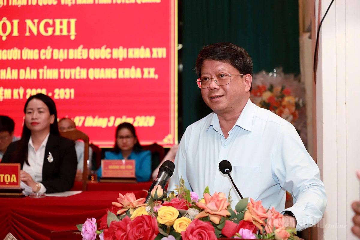 Tại Hội nghị, đại diện Ban Thường trực Ủy ban MTTQ Việt Nam tỉnh đã giới thiệu tiểu sử tóm tắt của các ứng cử viên đại biểu HĐND tỉnh khóa XX, nhiệm kỳ 2026 - 2031, đơn vị bầu cử số 2 gồm các ông, bà: Âu Thị Mai, Ủy viên BCH Đảng bộ tỉnh, Phó Chủ tịch Ủy ban MTTQ Việt Nam tỉnh, Chủ tịch Hội LHPN tỉnh; Trần Thị Hà, Phó Trưởng ban Pháp chế, HĐND tỉnh; Hoàng Lê Huy, Phó Trưởng phòng Quy hoạch Đầu tư xây dựng, Văn phòng UBND tỉnh; Nguyễn Thị Hồng Xiêm, Phó Trưởng phòng Đô thị và Nhà ở, Sở Xây dựng tỉnh; Nguyễn Minh Anh Tuấn, Hiệu trưởng Trường Đại học Tân Trào; Nguyễn Thị Hải Yến, Bí thư Đoàn xã Hồng Sơn; Trần Thị Hải Yến, giáo viên trường Mầm non Văn Phú, xã Hồng Sơn.