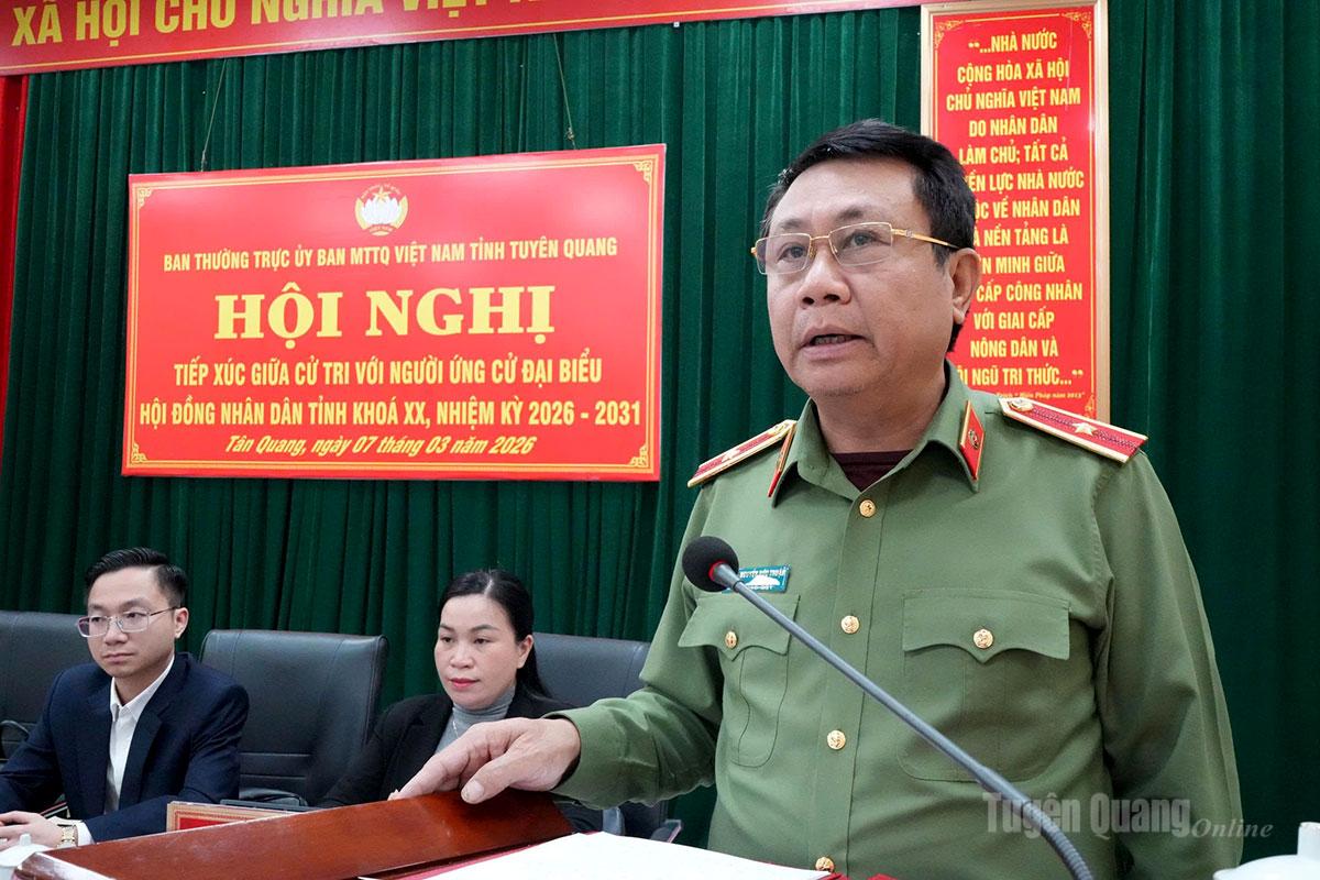 Tiếp thu, ghi nhận những ý kiến, kiến nghị, nguyện vọng chính đáng của cử tri xã Tân Quang, thay mặt các ứng cử viên, Thiếu tướng Nguyễn Đức Thuận, Ủy viên BTV Tỉnh ủy, Giám đốc Công an tỉnh trân trọng cảm ơn cơ quan Ủy ban MTTQ tỉnh, cấp ủy, chính quyền địa phương và cử tri xã đã quan tâm, tham dự đông đủ, đóng góp nhiều ý kiến thẳng thắn, tâm huyết, trách nhiệm đối với chương trình hành động của các ứng cử viên, những ý kiến tâm huyết, trách nhiệm của cử tri là cơ sở quan trọng để các ứng cử viên đại biểu HĐND tỉnh tiếp tục hoàn thiện chương trình hành động, bảo đảm sát thực tiễn, khả thi, phù hợp, đồng thời mong muốn cử tri tiếp tục quan tâm, theo dõi, giám sát và ủng hộ giúp đỡ để các ứng cử viên hoàn thành tốt nhiệm vụ của người đại biểu Nhân dân nếu được bầu, góp phần xây dựng địa phương ngày càng phát triển.
