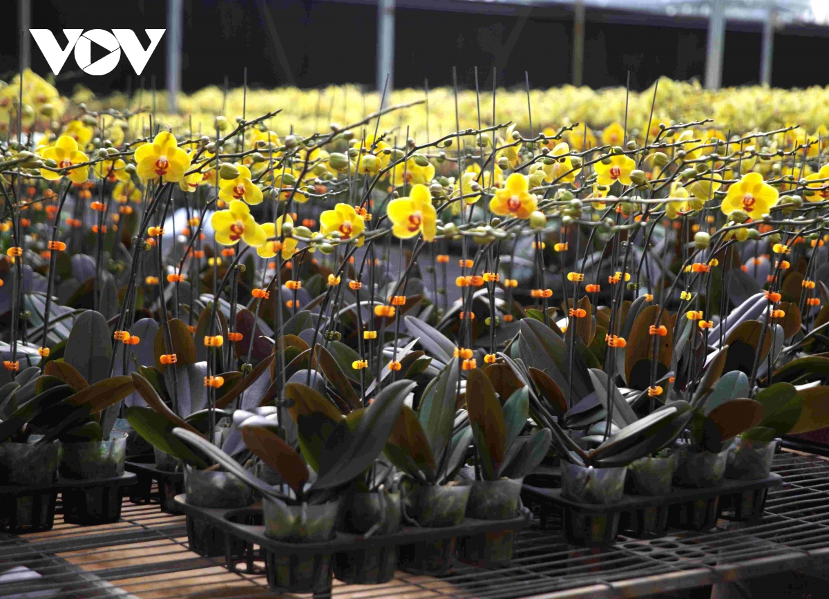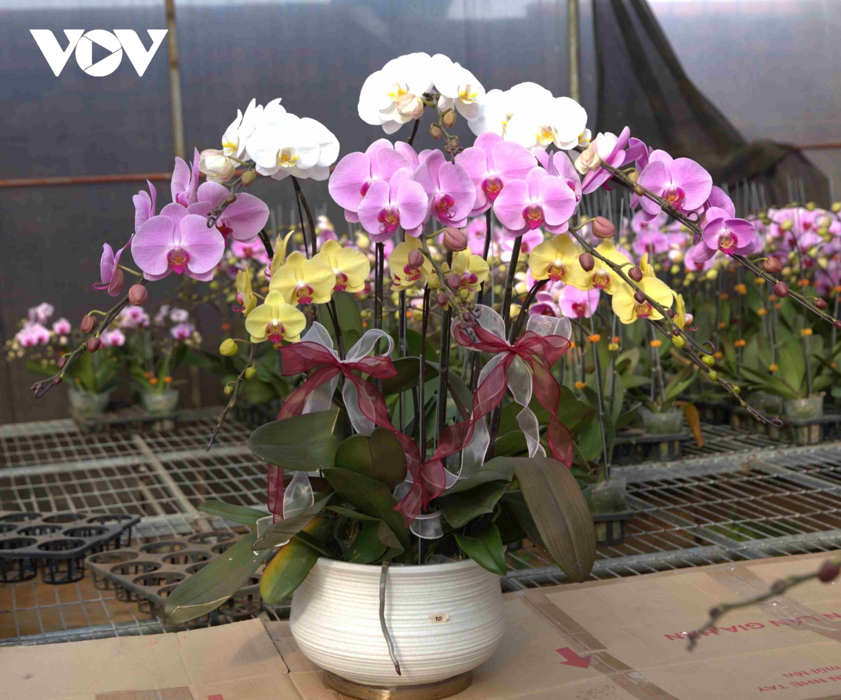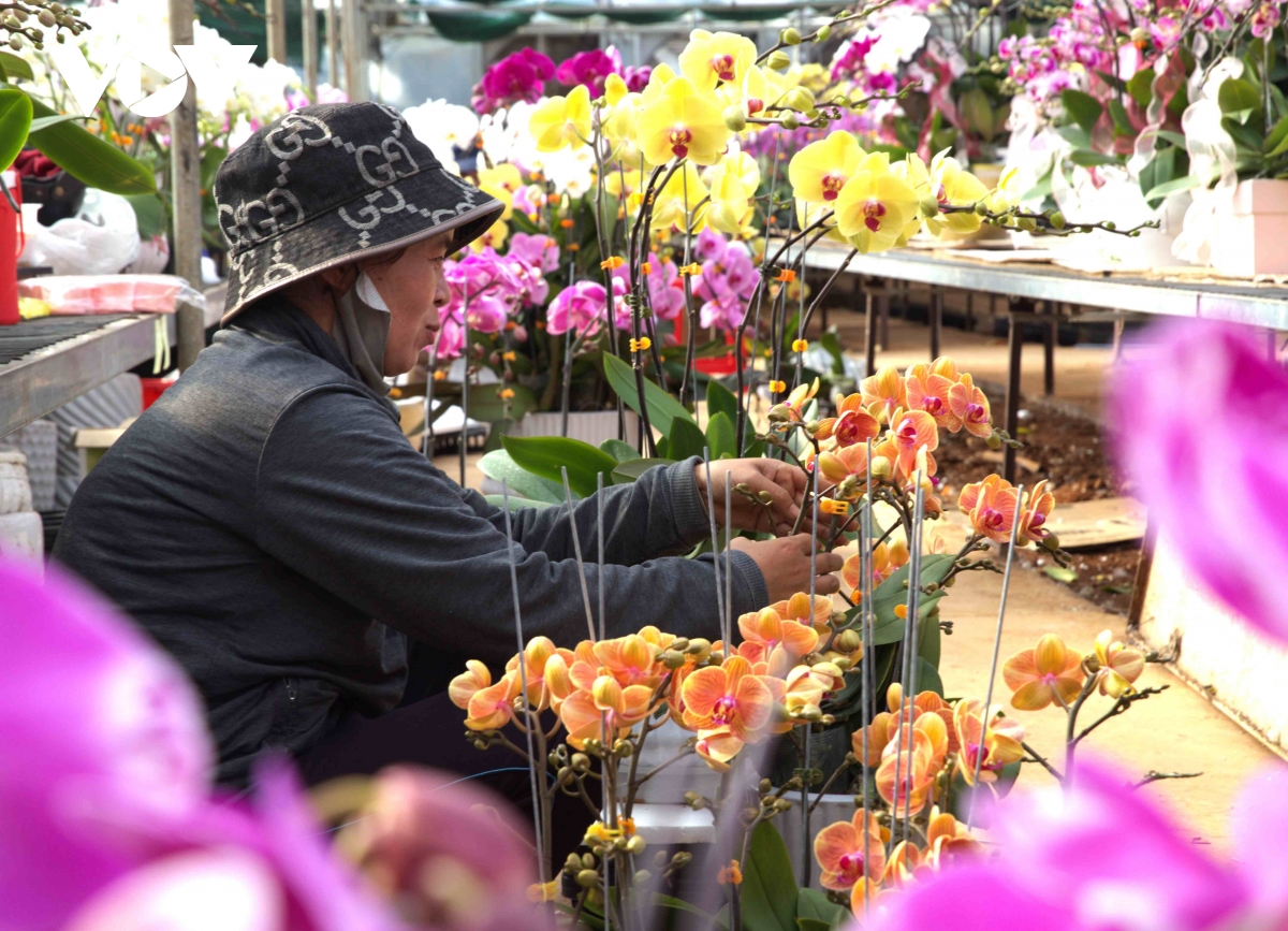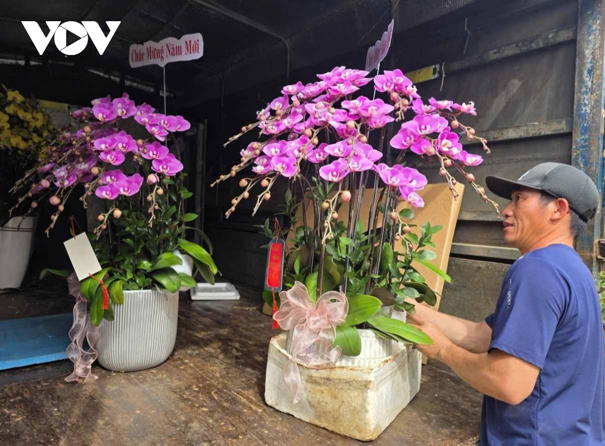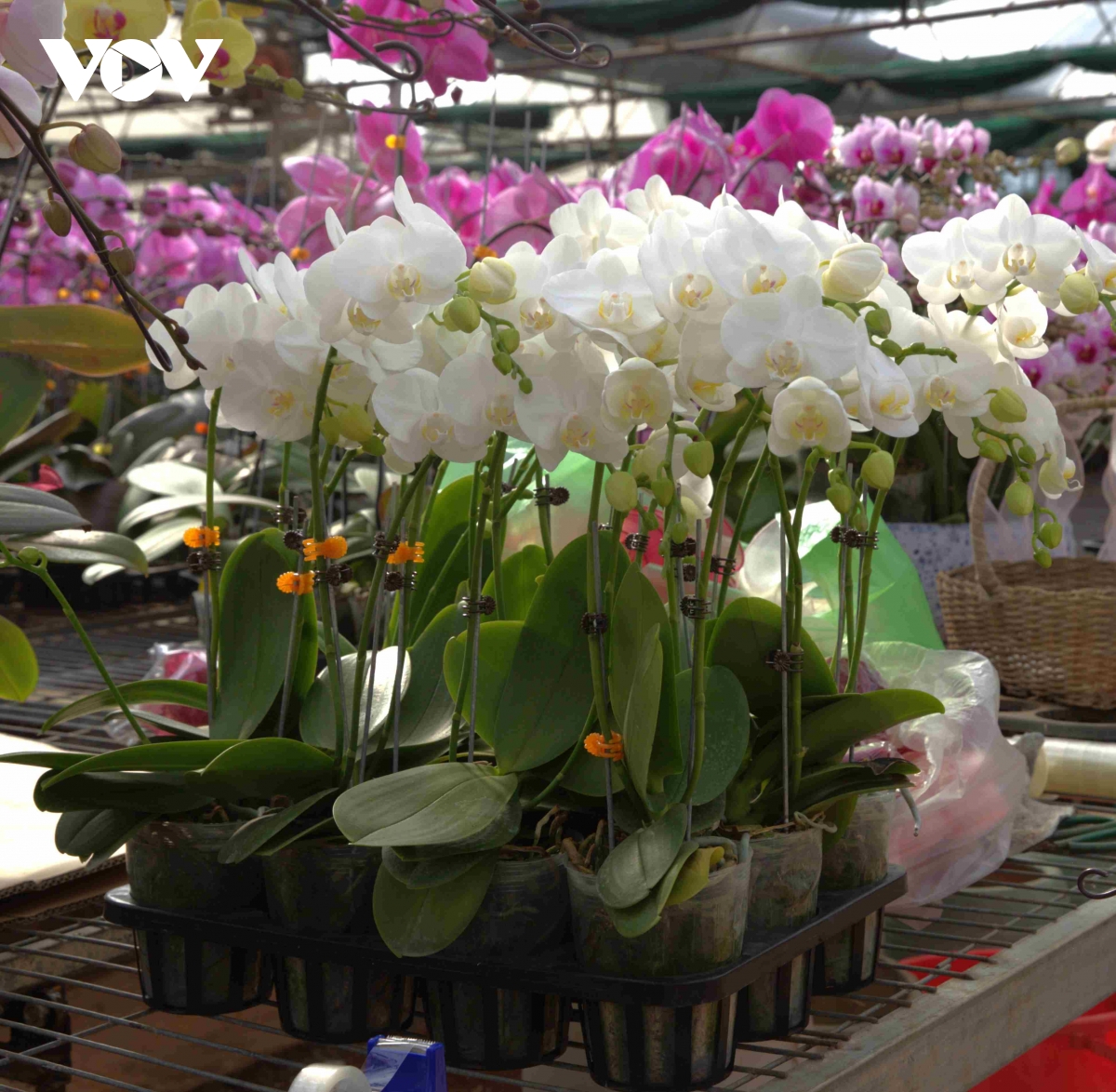 Mỗi cây lan Hồ Điệp đơn lẻ có giá sỉ tại vườn khoảng 150–180 nghìn đồng, tùy số lượng hoa và nụ, không tăng nhiều so với năm ngoái.