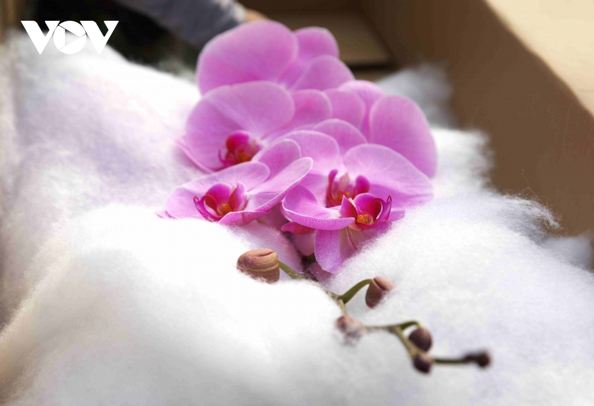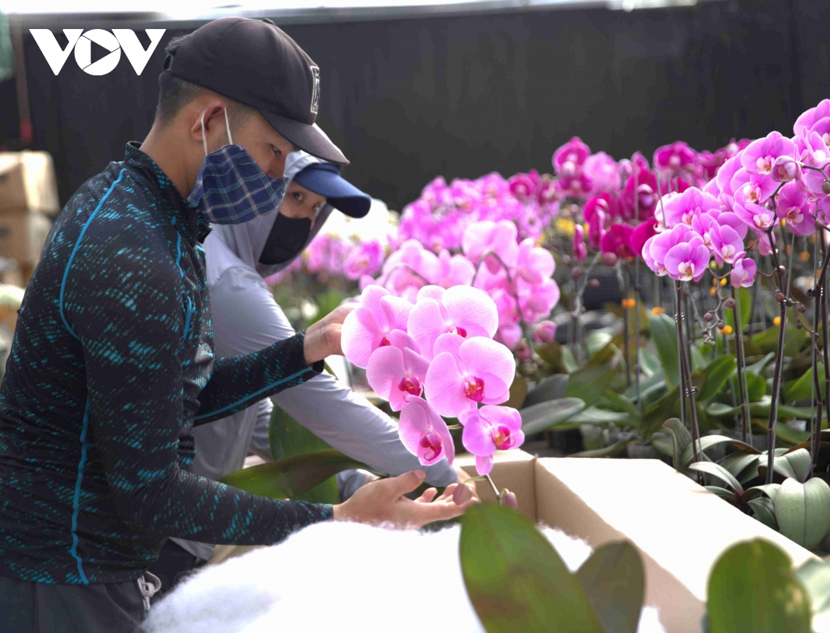 Hai công nhân đang đóng gói những cây lan Hồ Điệp màu hồng để xuất đi thành phố Hà Nội.