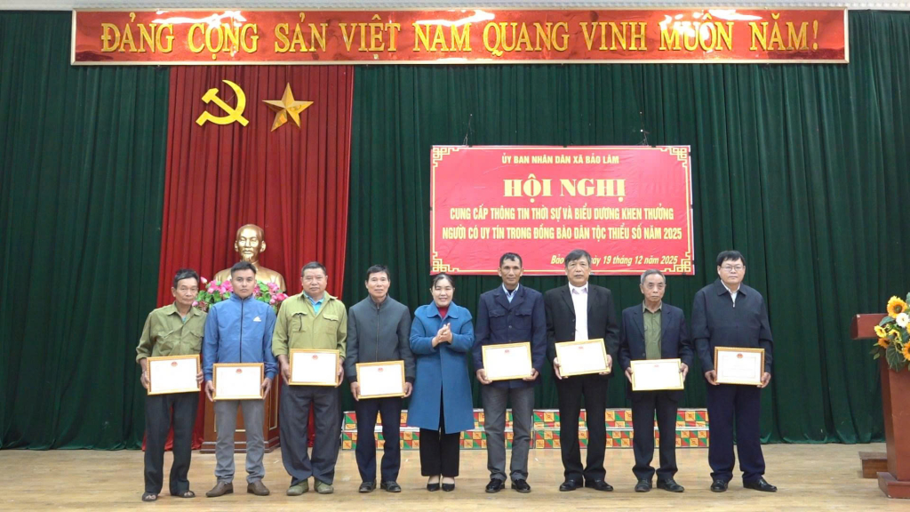 Nhân dịp này, UBND xã Bảo Lâm tặng giấy khen cho 10 cá nhân là điển hình tiên tiến, người có uy tín tiêu biểu trong vùng đồng bào dân tộc thiểu số trên địa bàn xã năm 2025.
