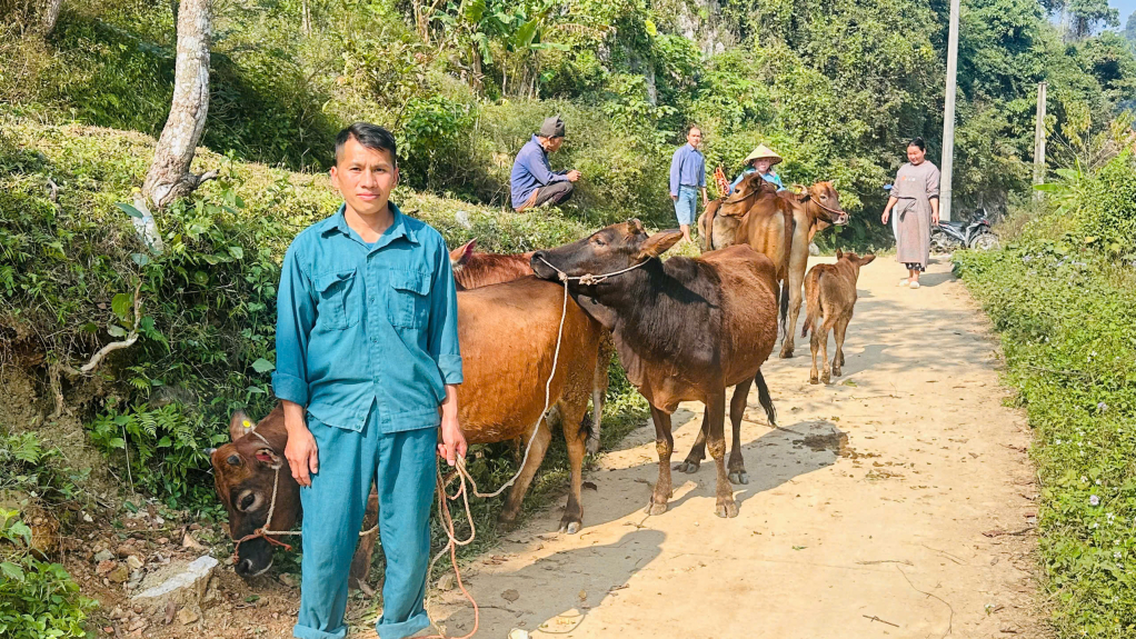 Người dân xóm Lũng Phầy nhận bò cái giống.