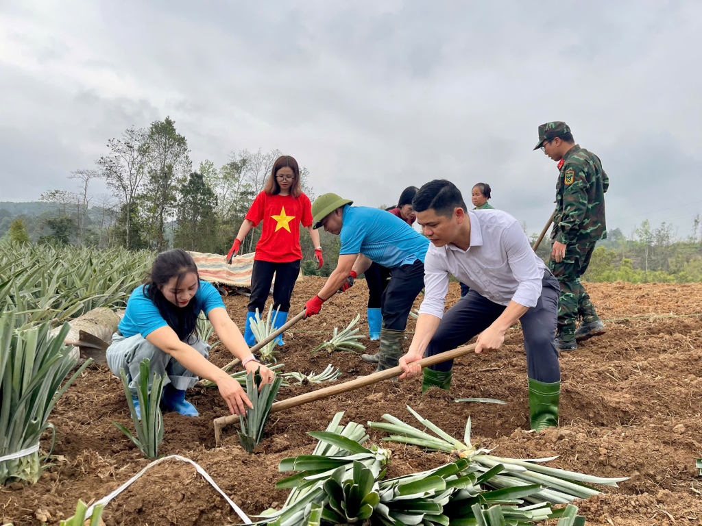 Các đồng chí lãnh đạo tham gia trồng dứa tại xóm Khủoi Kép.