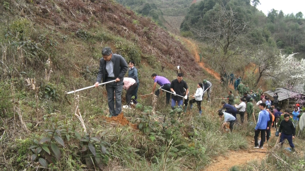 Sau lễ phát động, các lực lượng ra quân trồng 1.000 sa mộc tại đất rừng của hộ gia đình ông Phùng Chàn Tòng, xóm Hói Ngửa.