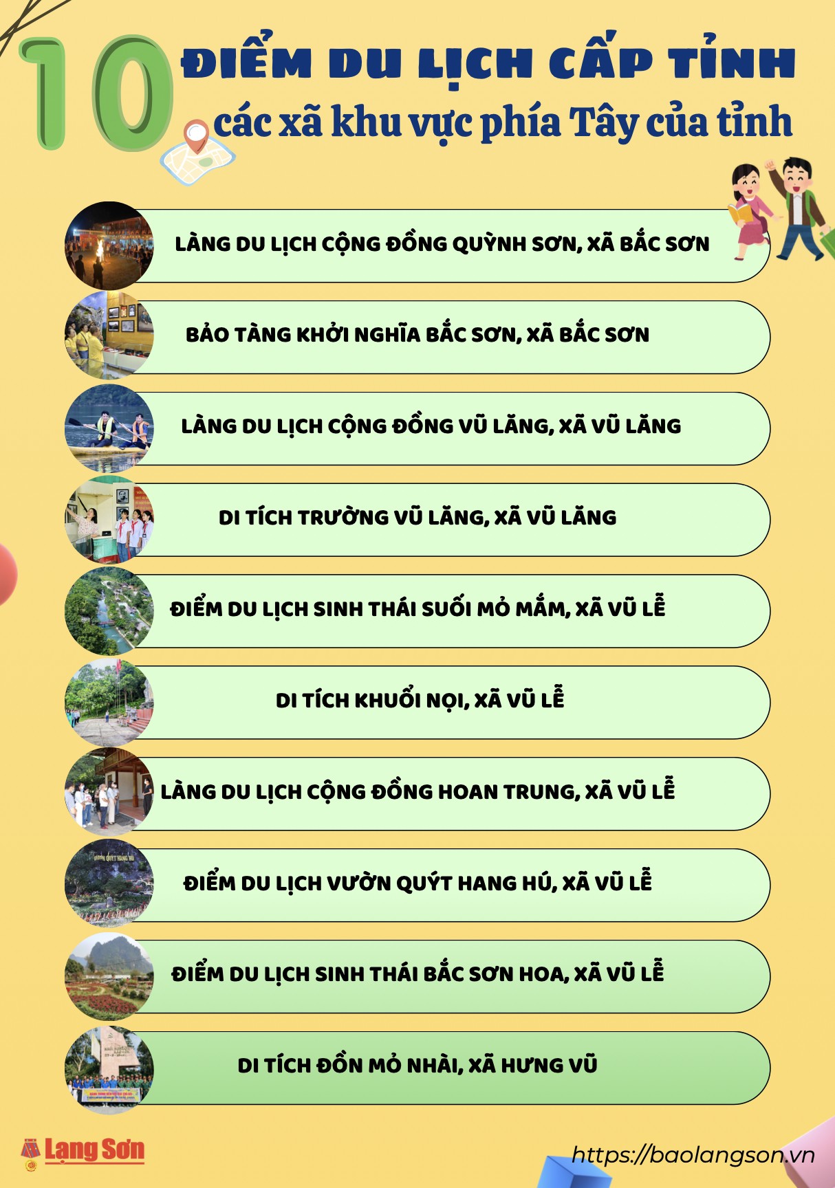 Thực tế, ngoài 27 khu, điểm di tích, trên địa bàn 6 xã thuộc khu vực phía Tây của tỉnh Lạng Sơn hiện có 3 điểm du lịch cộng đồng, 3 điểm du lịch sinh thái và 4 điểm du lịch lịch sử, văn hóa. Với truyền thống lịch sử cách mạng, những nét văn hóa đặc sắc của địa phương, cùng với cảnh quan thiên nhiên tươi đẹp, các điểm du lịch trên địa bàn 6 xã đã và đang hút du khách.