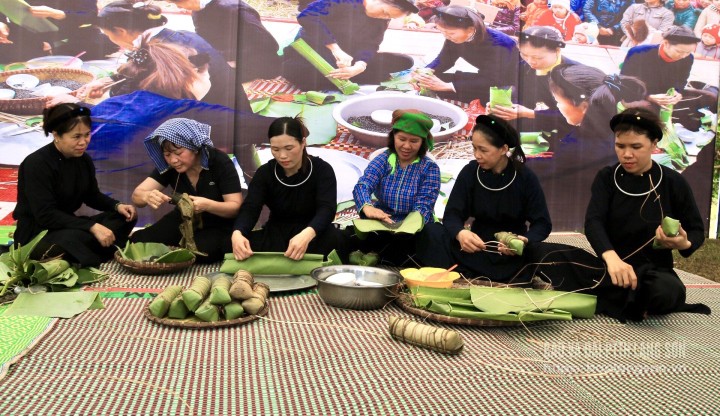 Du khách trải nghiệm gói bánh chưng đen tại xã Bắc Sơn