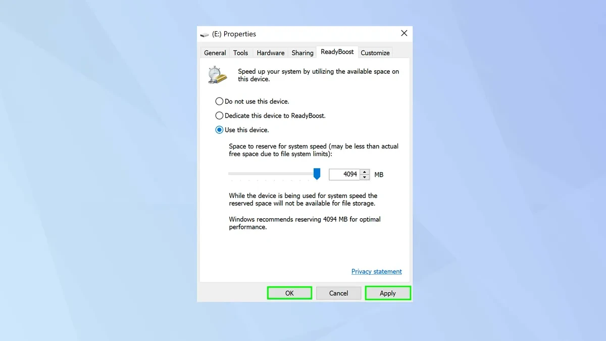Cuối cùng, nhấn Apply rồi chọn OK. Hệ thống sẽ tạo một tệp cache chuyên dụng trên USB. Lúc này, máy tính của bạn đã bắt đầu sử dụng USB như một bộ nhớ hỗ trợ để xử lý các tác vụ mượt mà hơn.