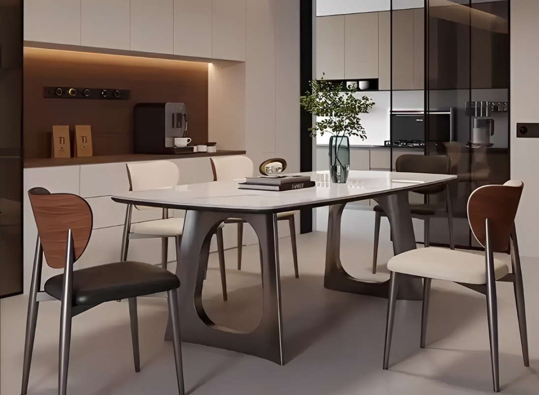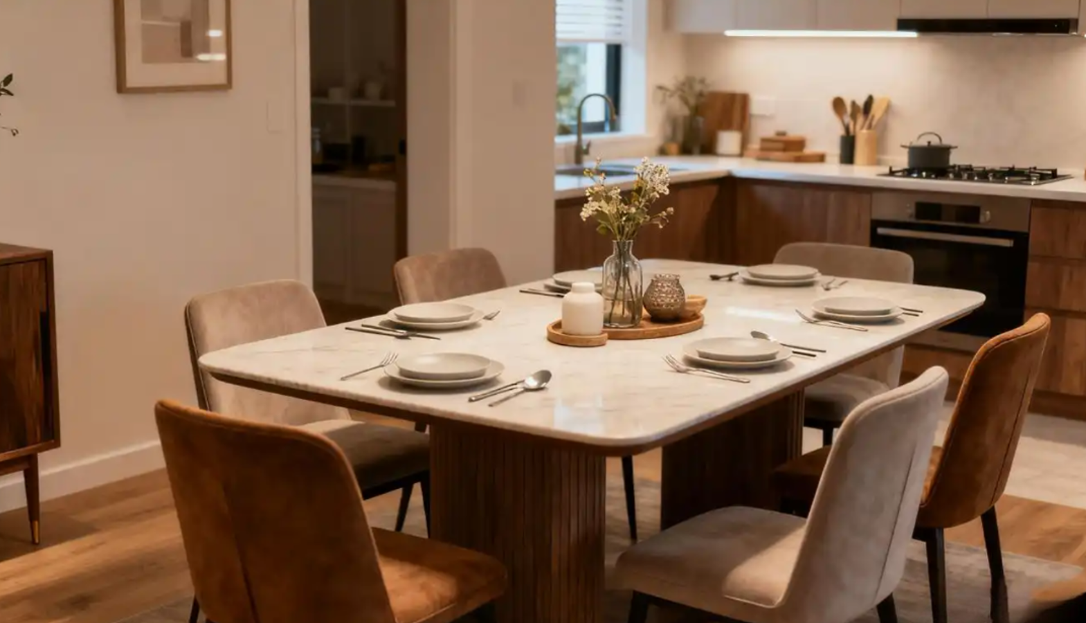 Bàn ăn đặt đúng hướng, ánh sáng dịu và không đối diện cửa chính giúp năng lượng phòng ăn lưu thông, bữa cơm ngon miệng.
