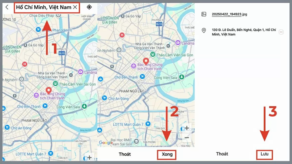 Bước 4: Chọn địa điểm mong muốn trên bản đồ, nhấn Xong, rồi bấm Lưu để hoàn tất quá trình thêm định vị vào ảnh.