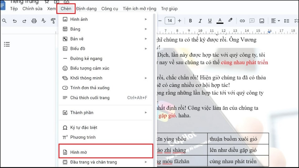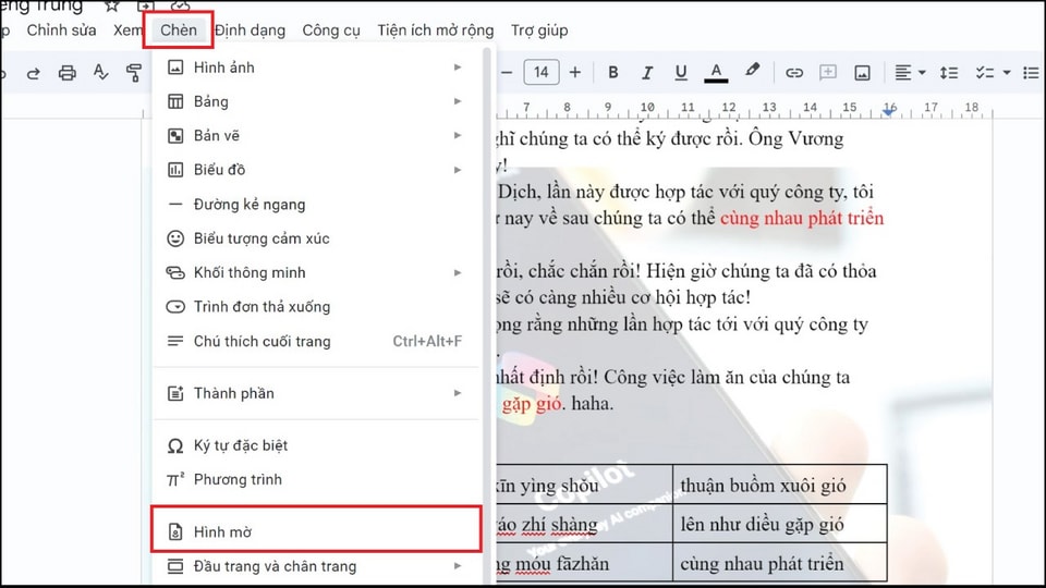 Truy cập công cụ Hình mờ từ menu Chèn.
