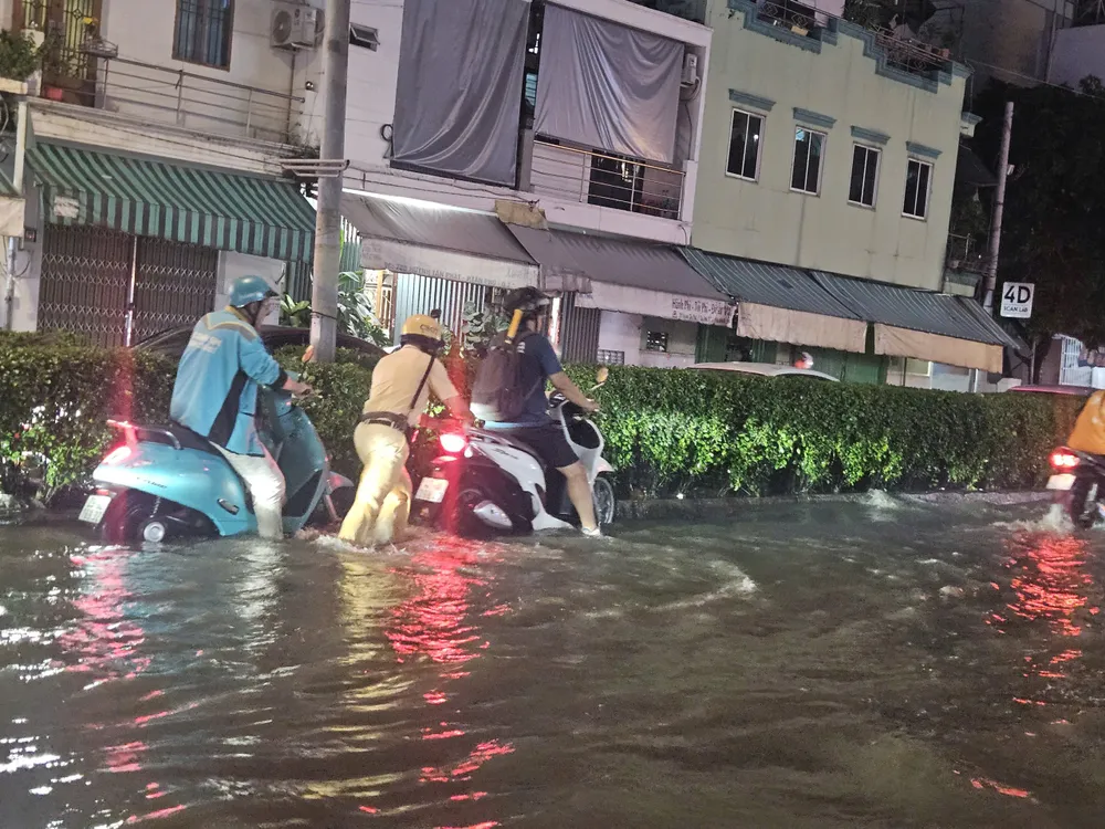 Lực lượng CSGT TP.HCM hỗ trợ người dân đi qua vùng ngập vào tối ngày 6-11.