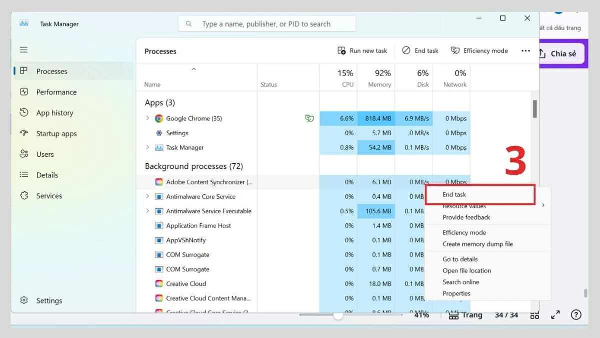Bước 3: Nhấp chuột phải vào ứng dụng cần tắt, chọn End Task.