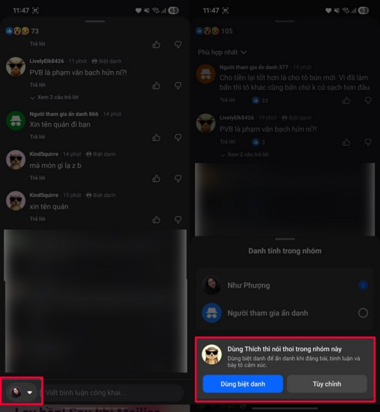Chọn chế độ 'Dùng biệt danh' trong phần bình luận.