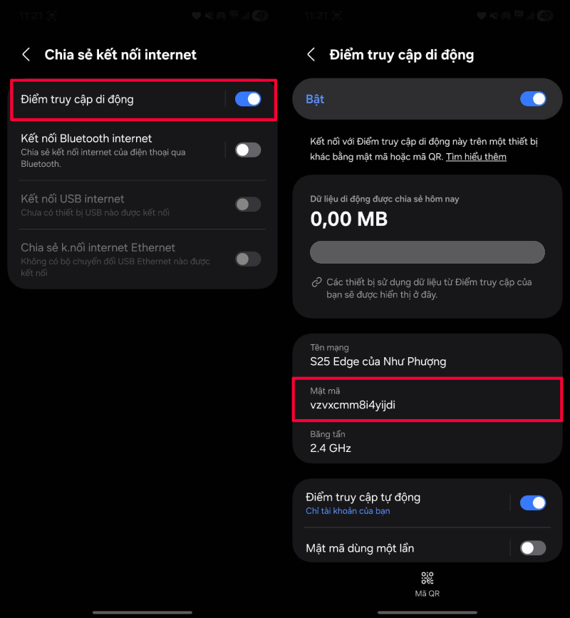 Bước 2: Bật Điểm truy cập di động, vào mục Điểm truy cập di động và tiến hành đổi mật khẩu mới theo ý muốn, sau đó lưu lại là xong.