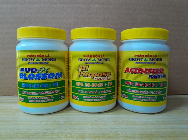 Grow More (Mỹ): Đây là thương hiệu được sử dụng rộng rãi, nổi bật với khả năng tan nhanh trong nước và không để lại cặn. Người dùng nên chọn sản phẩm có tem nhập khẩu chính hãng để đảm bảo chất lượng.