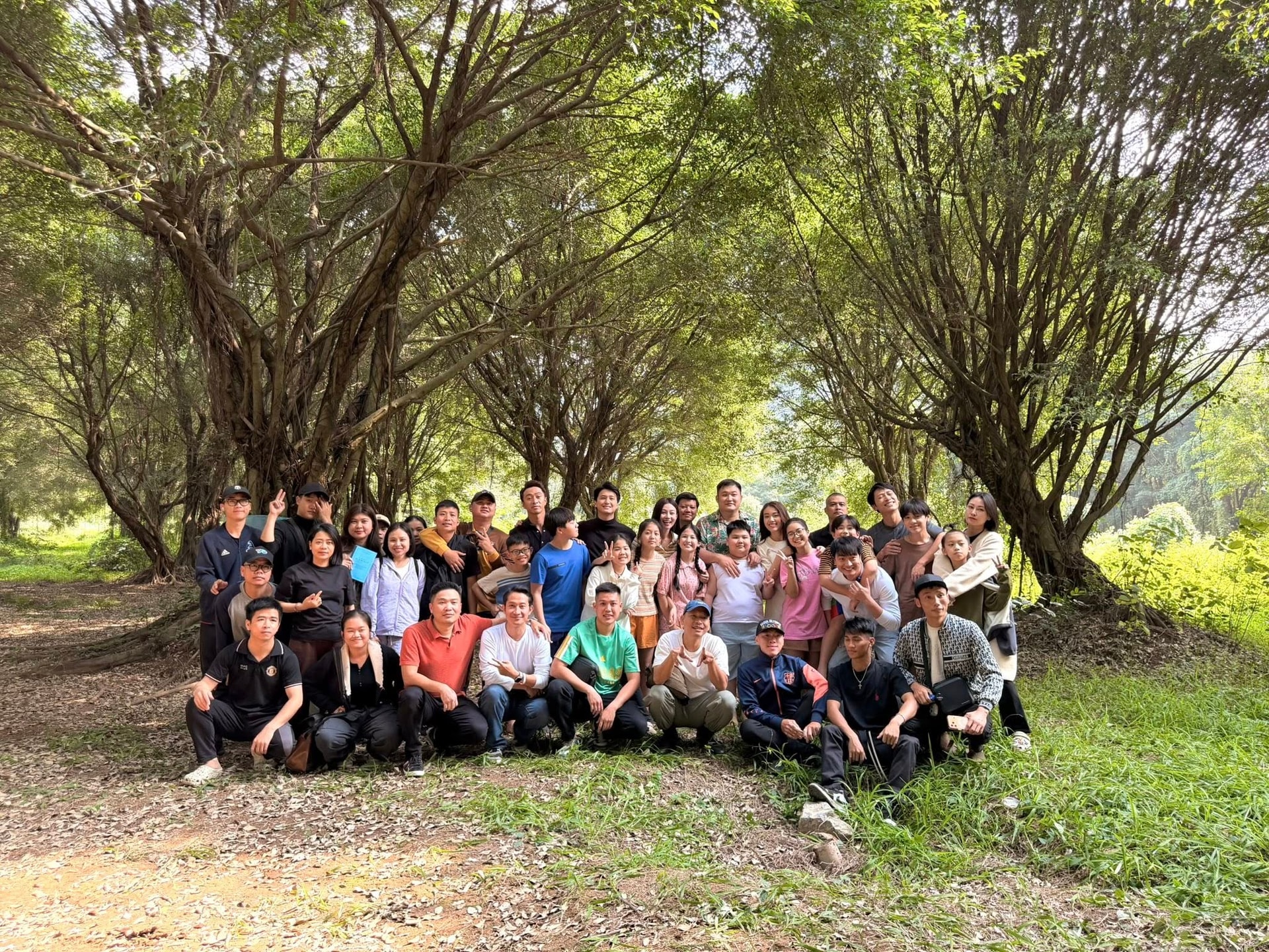 Các diễn viên và ekip đoàn phim trong một cảnh quay tập thể.