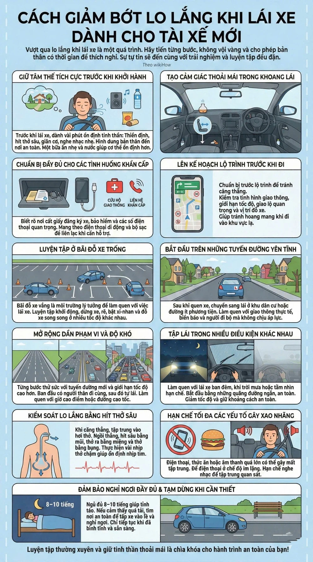 Theo wikiHow, cảm giác căng thẳng, hồi hộp khi cầm vô lăng là điều rất phổ biến với những người mới lái xe. Tuy nhiên, nếu biết chuẩn bị đúng cách và luyện tập từng bước, bạn hoàn toàn có thể kiểm soát nỗi lo này và dần xây dựng sự tự tin khi tham gia giao thông.