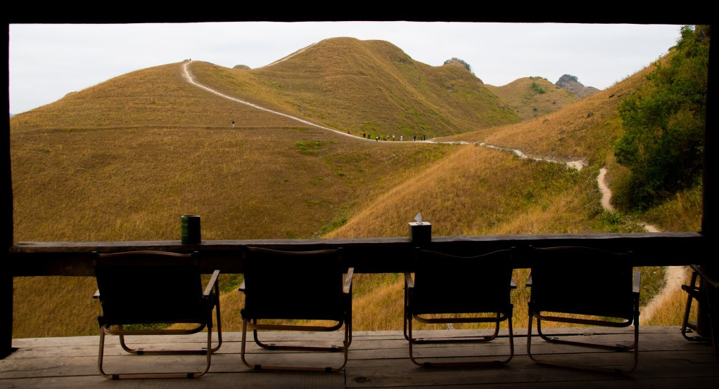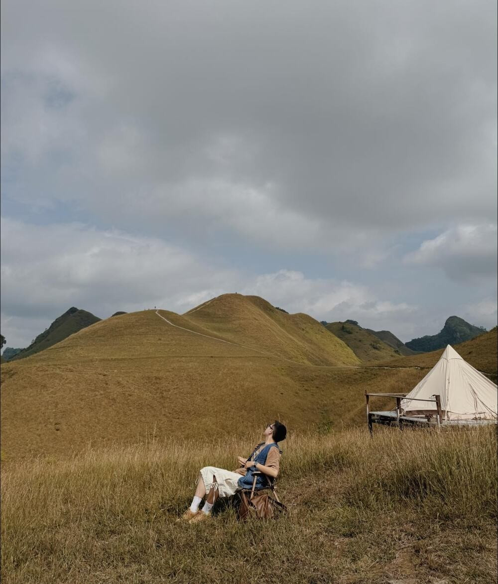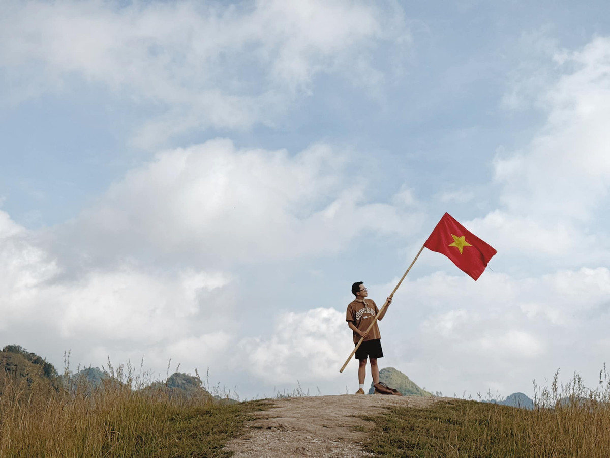 Từ đỉnh đồi, tầm nhìn mở rộng ra toàn cảnh bản làng thấp thoáng bên dưới, những thửa ruộng, dãy núi xanh ôm trọn thảm cỏ trải dài, khiến bất kỳ bức hình nào cũng đủ sức “triệu like”.