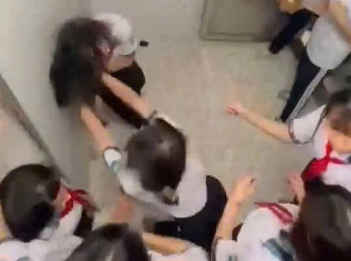 Theo clip, nữ sinh mặc đồng phục, đeo khăn quàng đỏ đứng nép trong một góc nhà vệ sinh thì bị nhóm bạn xông vào đánh: Dùng tay đấm vào đầu và mặt, dùng chân đạp, giật tóc và kéo lê trên sàn. Sự việc diễn ra trước sự chứng kiến và cổ vũ của nhiều học sinh khác, trong khi nạn nhân chỉ biết nằm dưới sàn chịu trận. Tất cả chỉ giải tán khi bị một thầy giáo phát hiện.