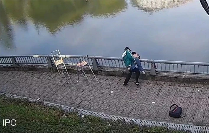 Nam sinh lớp 8 sau khi hành hung đã đẩy nạn nhân xuống hồ nước rồi bỏ đi. Ảnh cắt từ clip