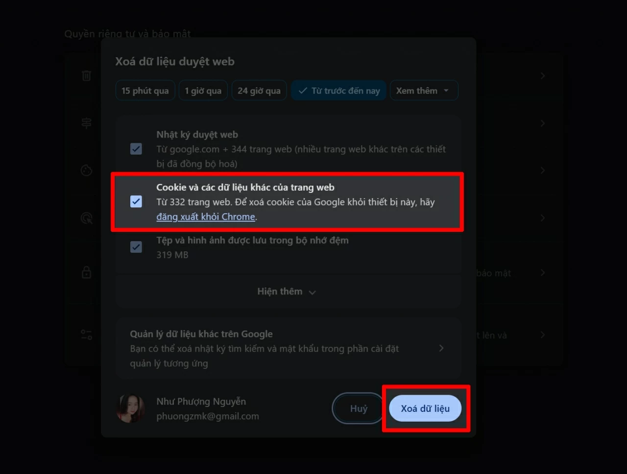 Xóa 2 bộ nhớ đệm (Cache) và Cookies