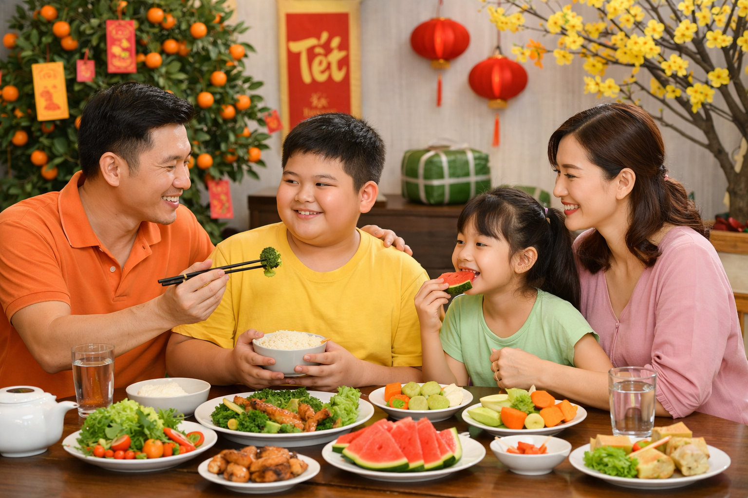 Bữa cơm Tết nên ưu tiên rau xanh, trái cây và khẩu phần hợp lý, giúp kiểm soát cân nặng và hỗ trợ sức khỏe cho trẻ thừa cân, béo phì.