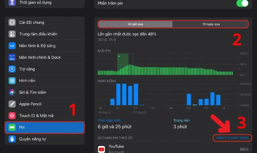 Bước 4: Ngoài ra, mục Hiển thị hoạt động sẽ cho biết ứng dụng nào tiêu tốn nhiều pin nhất trong 24 giờ hoặc 10 ngày qua, giúp bạn đánh giá mức độ hao pin thực tế của thiết bị.