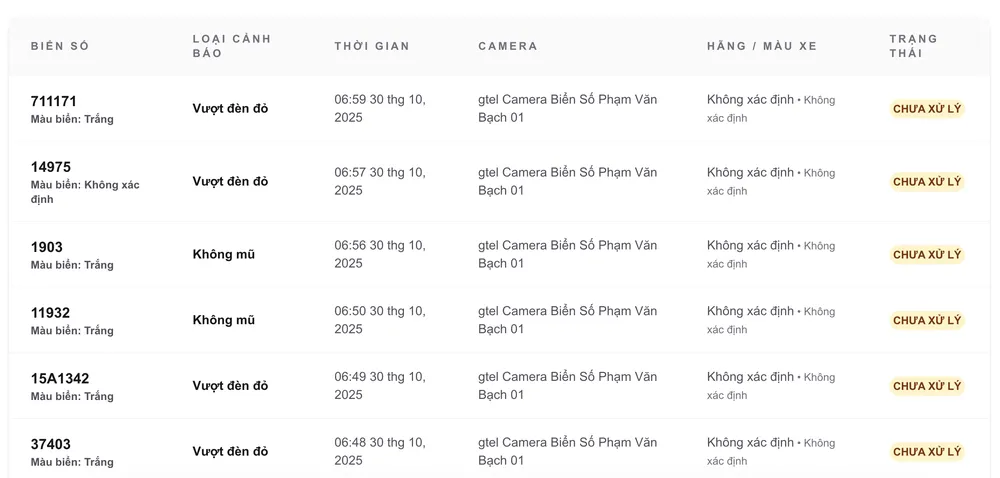 Danh sách các phương tiện vi phạm bị camera AI phát hiện. Ảnh: MINH HOÀNG