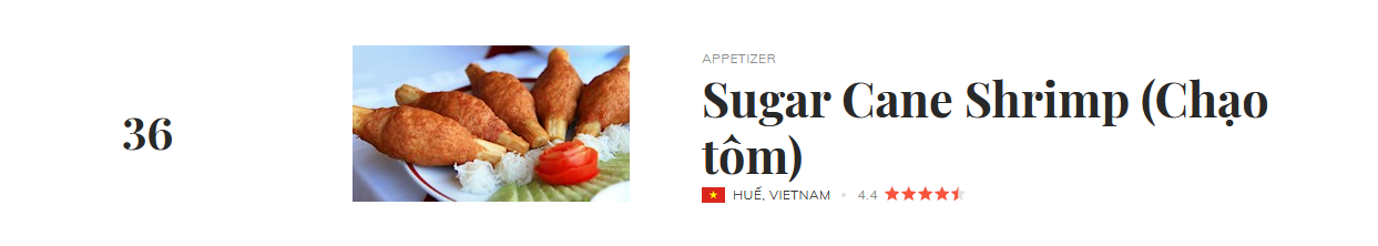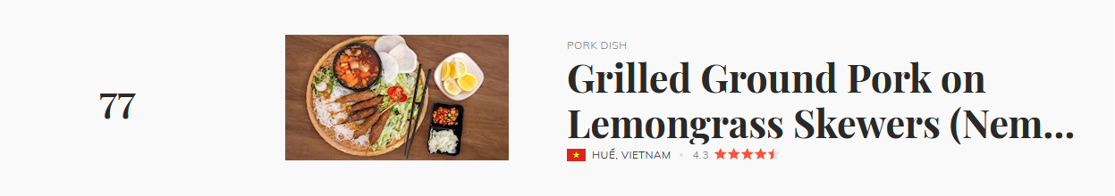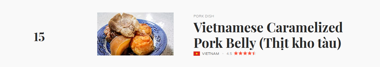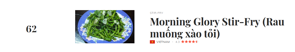 Theo đó, thịt kho tàu ở vị trí 15 (4,5 điểm sao đánh giá); chạo tôm xếp vị trí 36 (4,4 điểm sao đánh giá); rau muống xào tỏi vị trí 62 (4,3 điểm sao đánh giá). Cuối cùng là món nem lụi xếp vị trí 77 với điểm đánh giá đạt 4,3. Điểm chung của những món ăn này đều có thành phần nguyên liệu từ tỏi, loại gia vị đặc trưng của nhiều nềm ẩm thực thế giới, trong đó có Việt Nam.