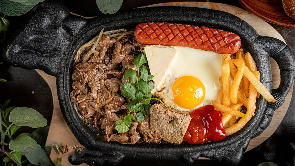 Chế biến: Đặt chảo lên bếp, cho vào chảo 2 muỗng canh dầu oliu, đợi đến khi dầu nóng cho hành tây cắt lát vào, xào với lửa vừa khoảng 2 phút đến khi hành thơm. Cho tiếp thịt bò đã ướp vào áp chảo đều 2 mặt với lửa vừa với mỗi mặt 3 phút sau đó cho 30g bơ lạt vào. Đợi đến khi bơ tan hết cho 1 cây xúc xích, 1 miếng pate và đập 1 cái trứng vào. Để chảo trên bếp thêm 2 phút đến khi trứng chín, pate và xúc xích vàng đều thì tắt bếp.
