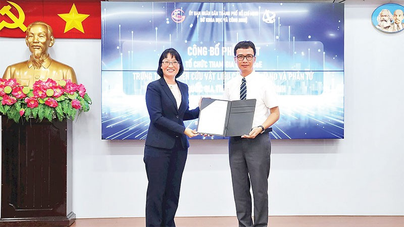 Phó Chủ tịch Ủy ban nhân dân Thành phố Hồ Chí Minh Trần Thị Diệu Thúy (bên trái) trao quyết định cho Trung tâm INOMAR tham gia Đề án CoE.