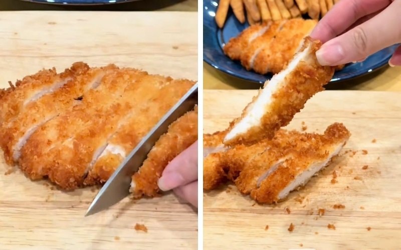 Ức gà sau khi mua về, bạn rửa sạch với nước muối loãng rồi để ráo. Có thể xẻ đôi miếng ức gà theo chiều ngang để thịt mỏng hơn, giúp gà chín đều và nhanh hơn khi chiên. Đối với khoai tây, gọt sạch vỏ, rửa lại với nước và cắt thành từng thanh dài có độ dày vừa phải, khoảng 5-7 cm.