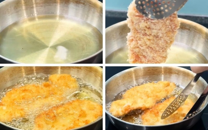 Bắc chảo lên bếp, cho một lượng dầu ăn đủ để ngập khoảng nửa miếng gà. Đợi dầu nóng già, bạn nhẹ nhàng thả gà đã tẩm bột vào chiên. Duy trì lửa ở mức vừa phải để gà chín đều từ trong ra ngoài mà không bị cháy lớp vỏ. Trở đều hai mặt cho đến khi gà có màu vàng ruộm và lớp vỏ ngoài giòn tan. Sau khi gà chín, vớt ra đĩa có lót giấy thấm dầu để loại bỏ bớt dầu thừa.