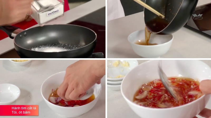 Bắc chảo lên bếp, cho 3 muỗng canh đường và 3 muỗng canh nước mắm vào, đun nhỏ lửa và khuấy đều cho đường tan hoàn toàn, sau đó đổ ra chén để nguội. Tiếp theo, thêm vào chén 4 muỗng canh giấm gạo, hành tím cắt lát, tỏi và ớt băm rồi trộn đều hỗn hợp.
