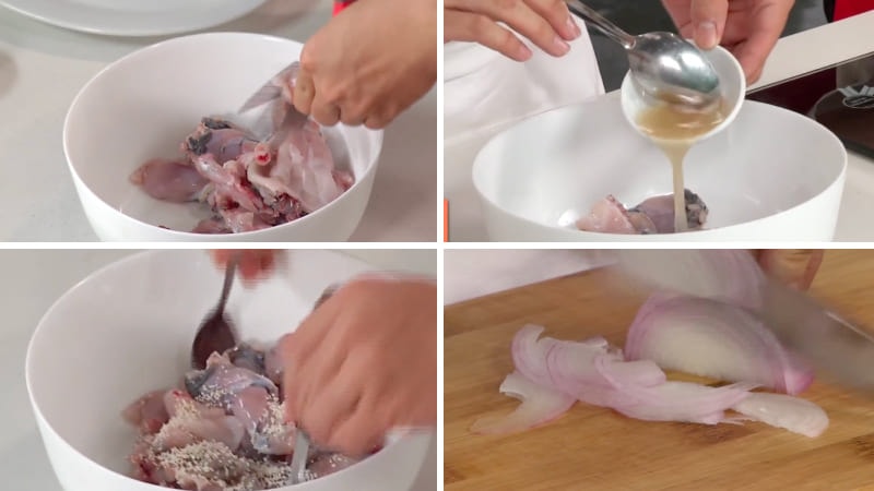 Ếch sau khi mua về, lột da, rửa sạch và cắt thành những miếng nhỏ vừa ăn. Ướp thịt ếch với 2 muỗng canh nước cốt hành tỏi và 1 muỗng canh hạt nêm, trộn đều và để khoảng 15 phút cho thấm gia vị.