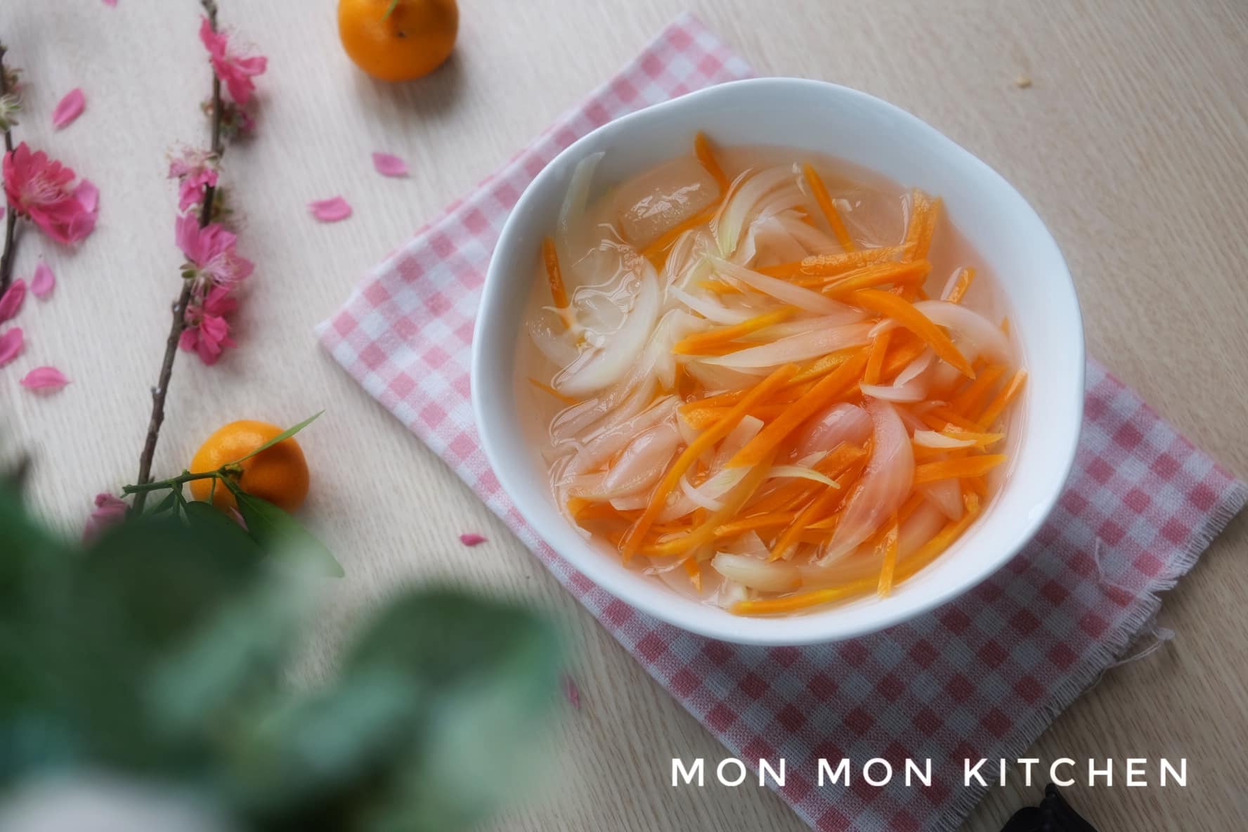 Cà rốt gọt vỏ, rửa sạch rồi thái sợi nhỏ hoặc bào sợi mảnh để khi trộn dễ thấm gia vị. Hành tây bóc vỏ, rửa sạch và thái mỏng.